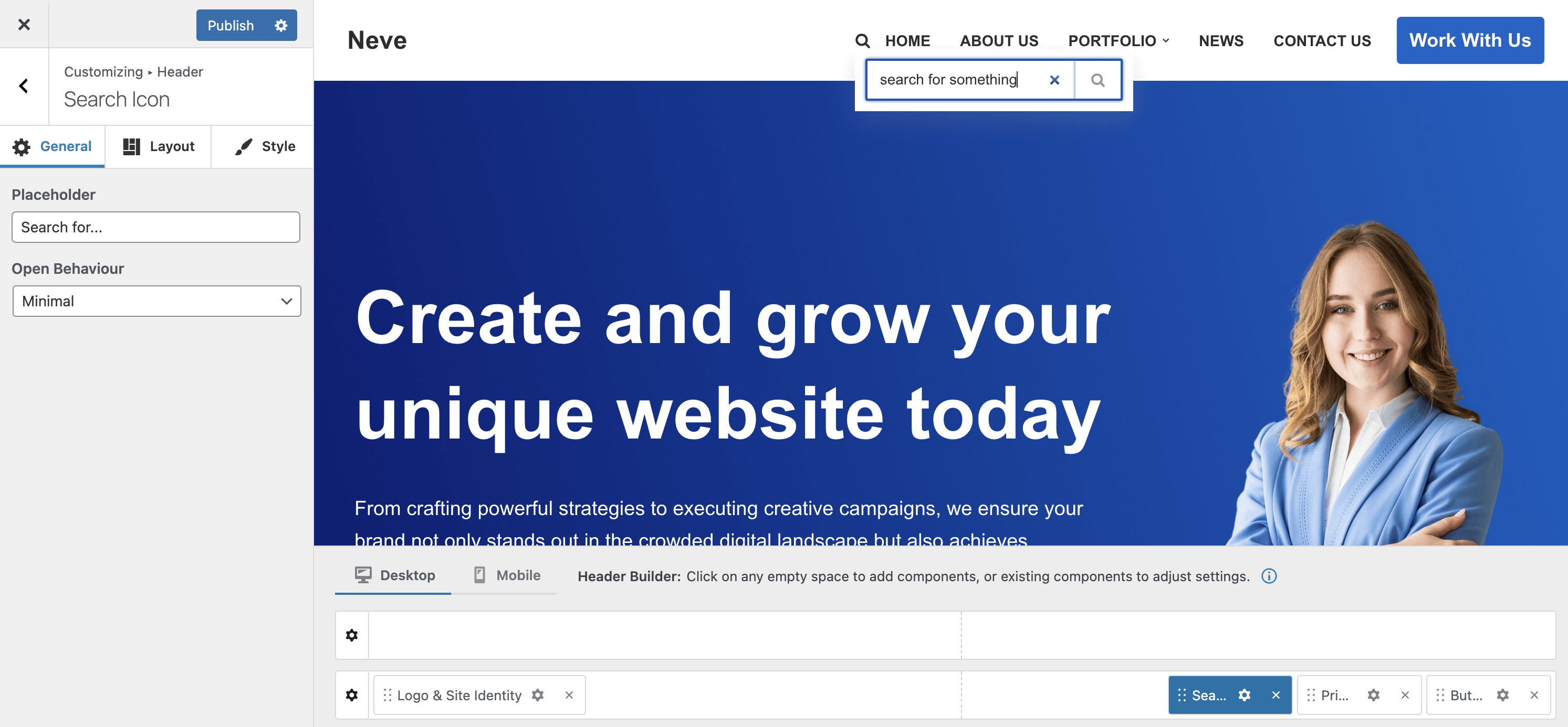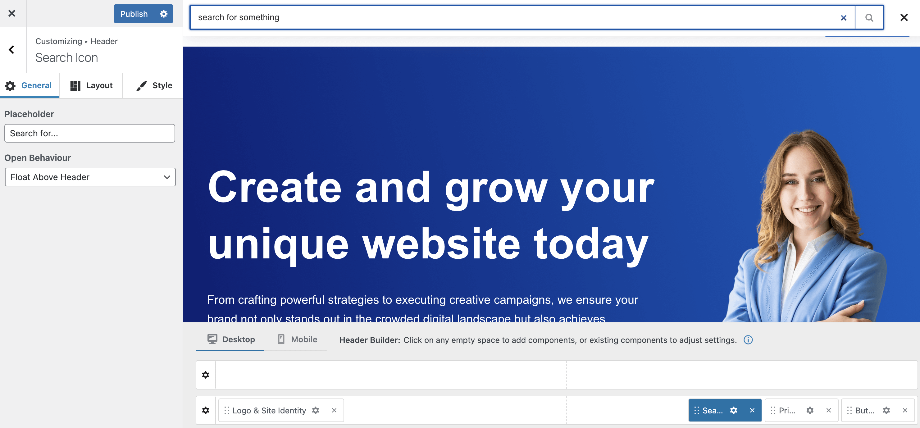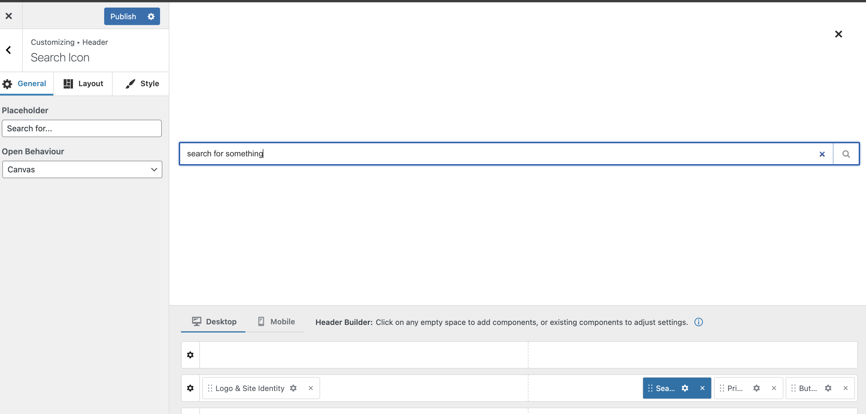 When clicked, the search icon opens a search form field. The Open Behaviour option is in charge of controlling the way in which that form field appears for the user.