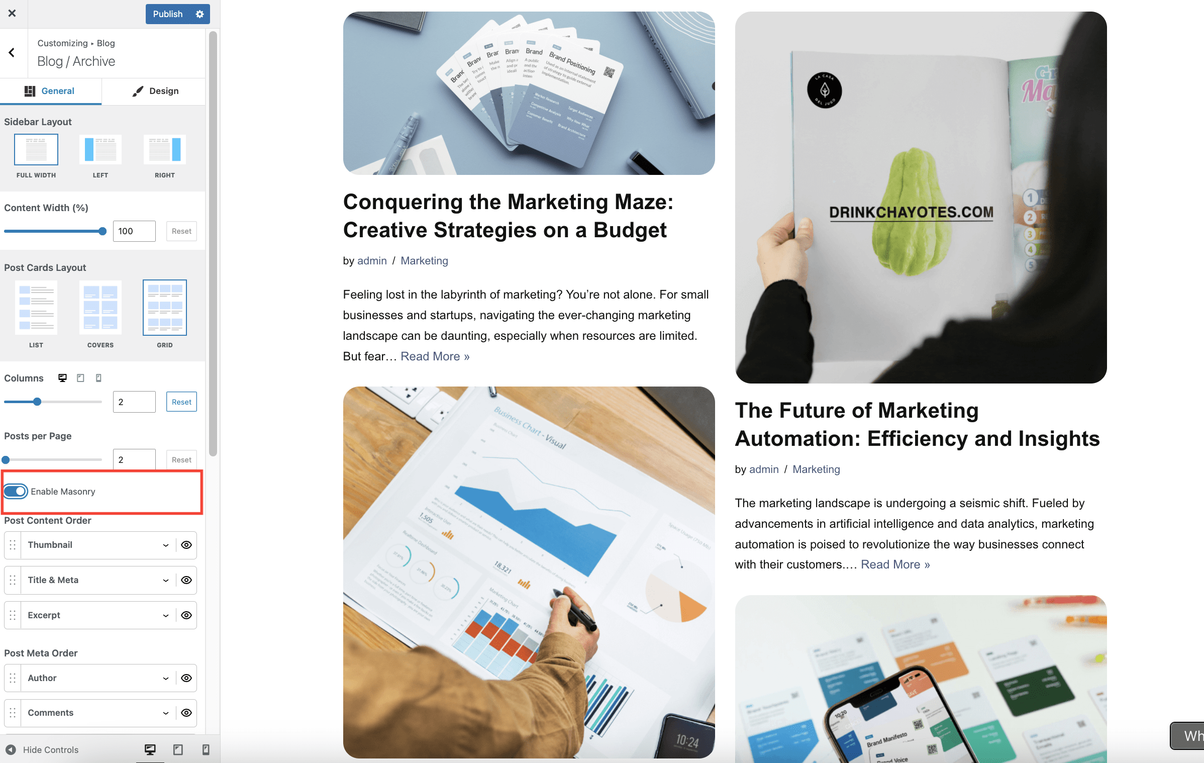 - Enable masonry - When masonry is enabled, items are arranged to minimize vertical gaps between them. Unlike the default grid with fixed row heights, masonry grids adjust the positioning of items dynamically based on their content height.
