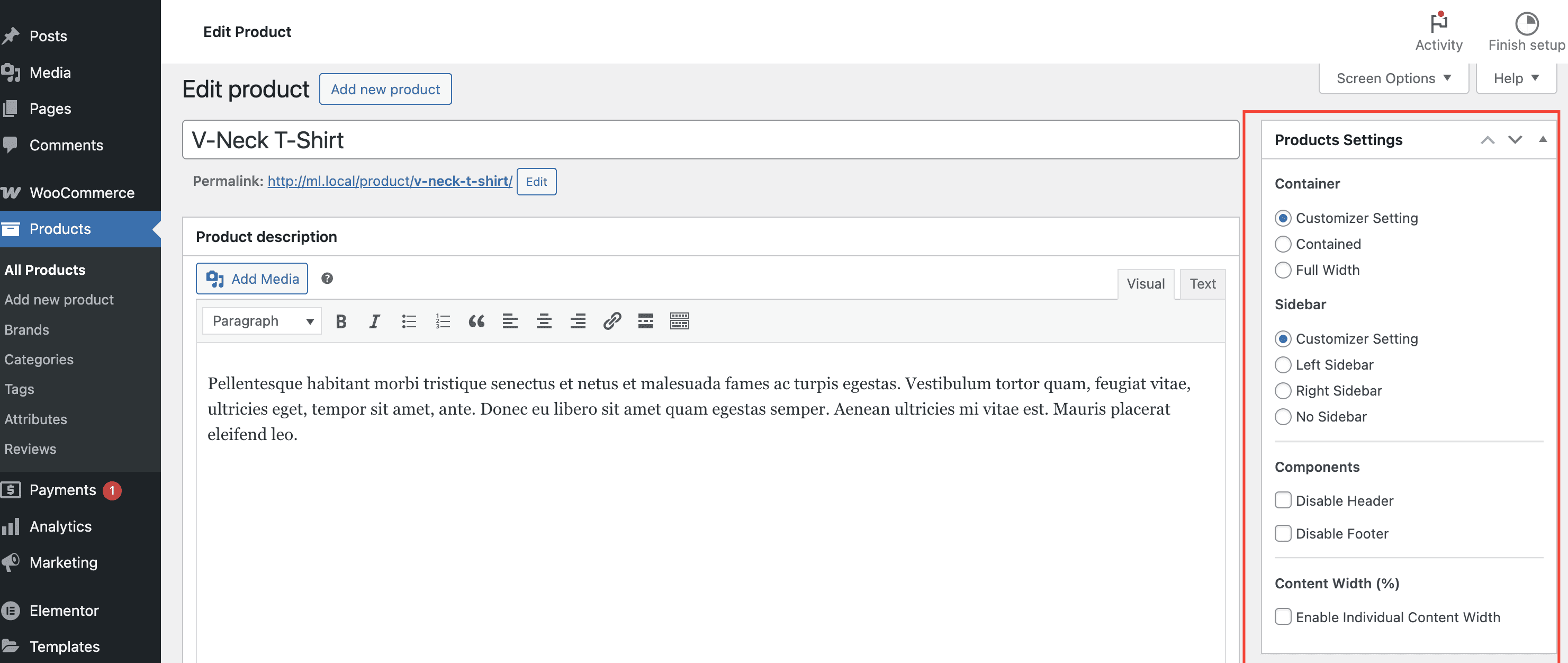 Besides the general options, each product has its own dedicated options (for sidebar, content width, enable/disable header and footer), in the product editor. If used, these options override the ones from Customize.