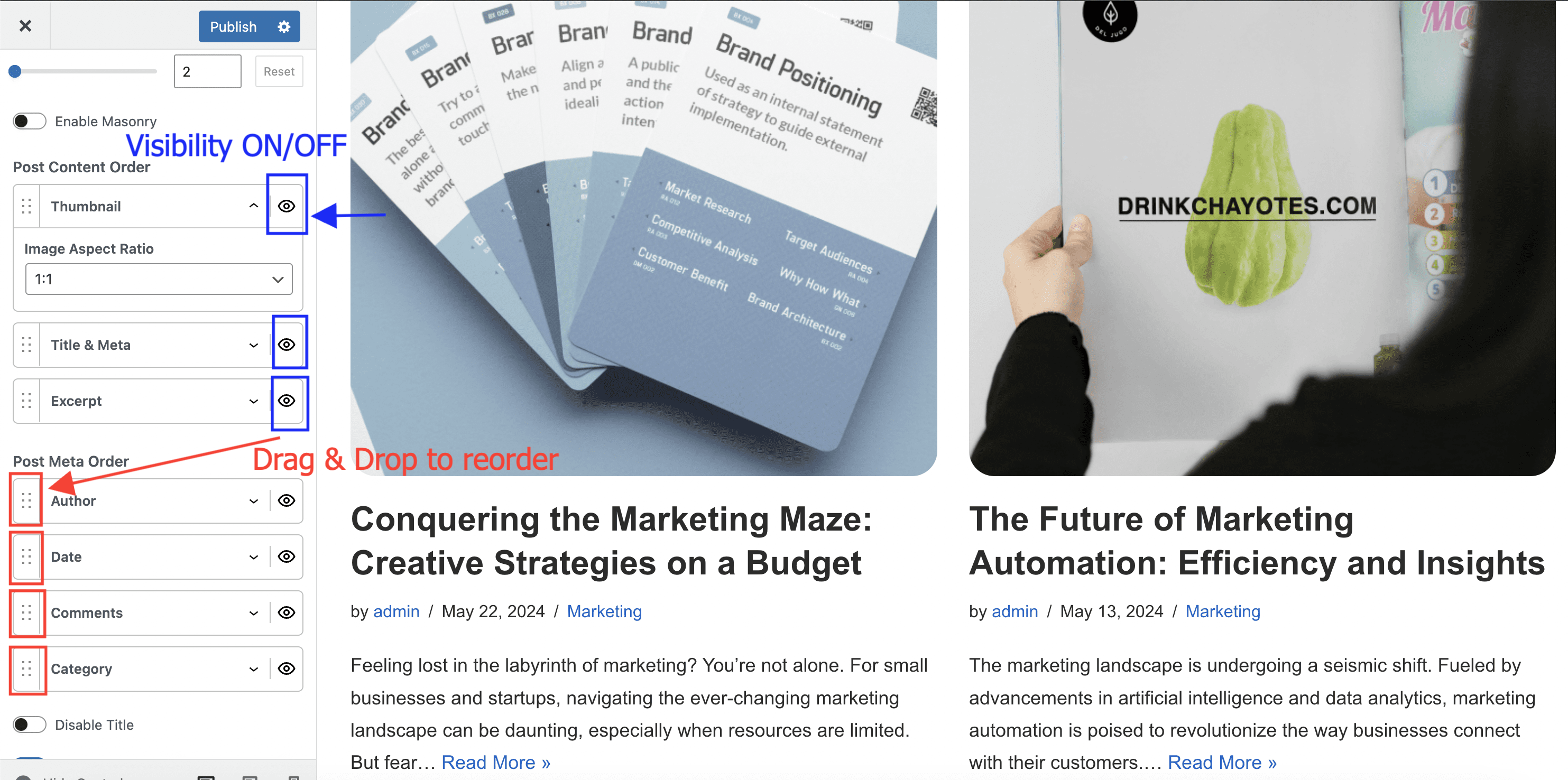 - The Post Content Order and Post Meta Order options allows you to choose a specific layout of each post displayed on the Blog page. Drag & drop elements to reorder them, or click on the little eye icon to show/hide them.