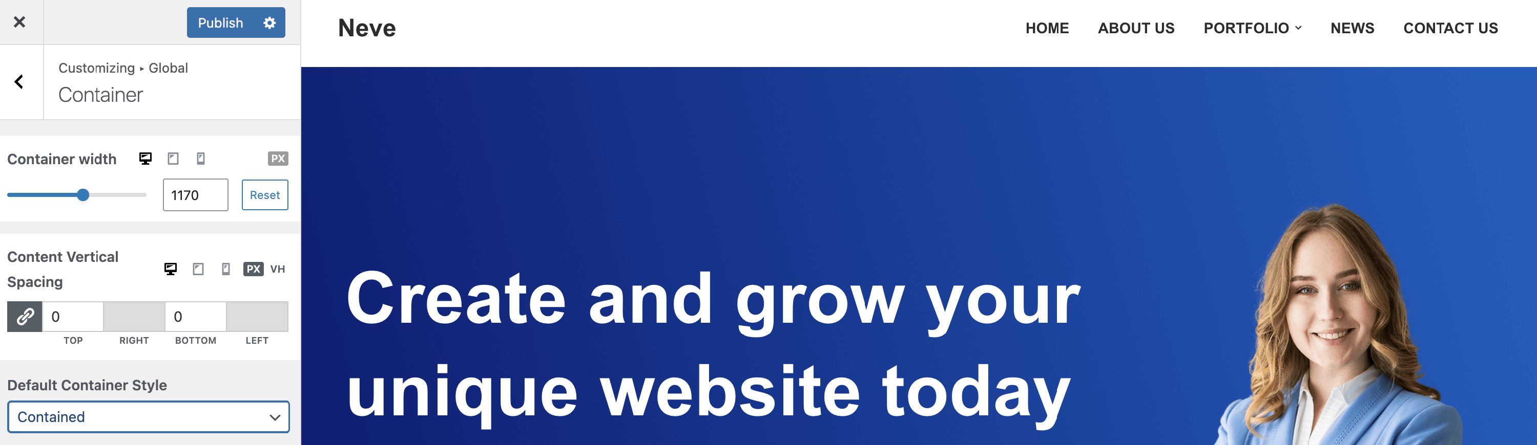 Navigate to Appearance > Customize > Global > Container to access the options.