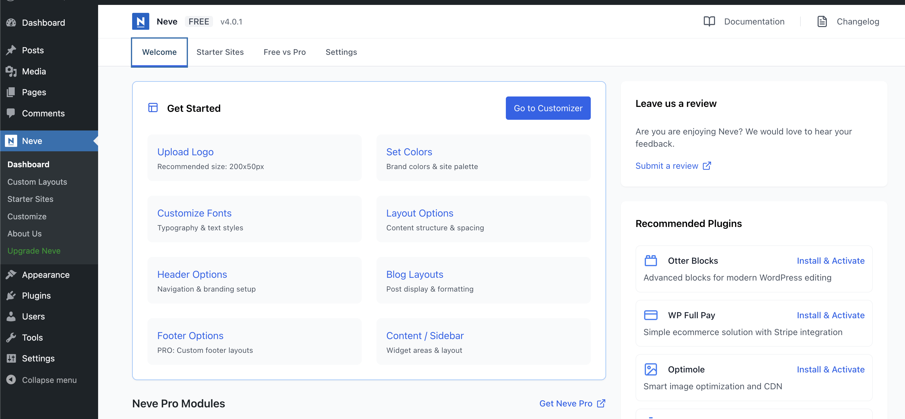 The central hub of Neve's options is under Neve > Dashboard. There you can find the documentation, the product changelog, quick links for Customizer options and plugins recommendations.