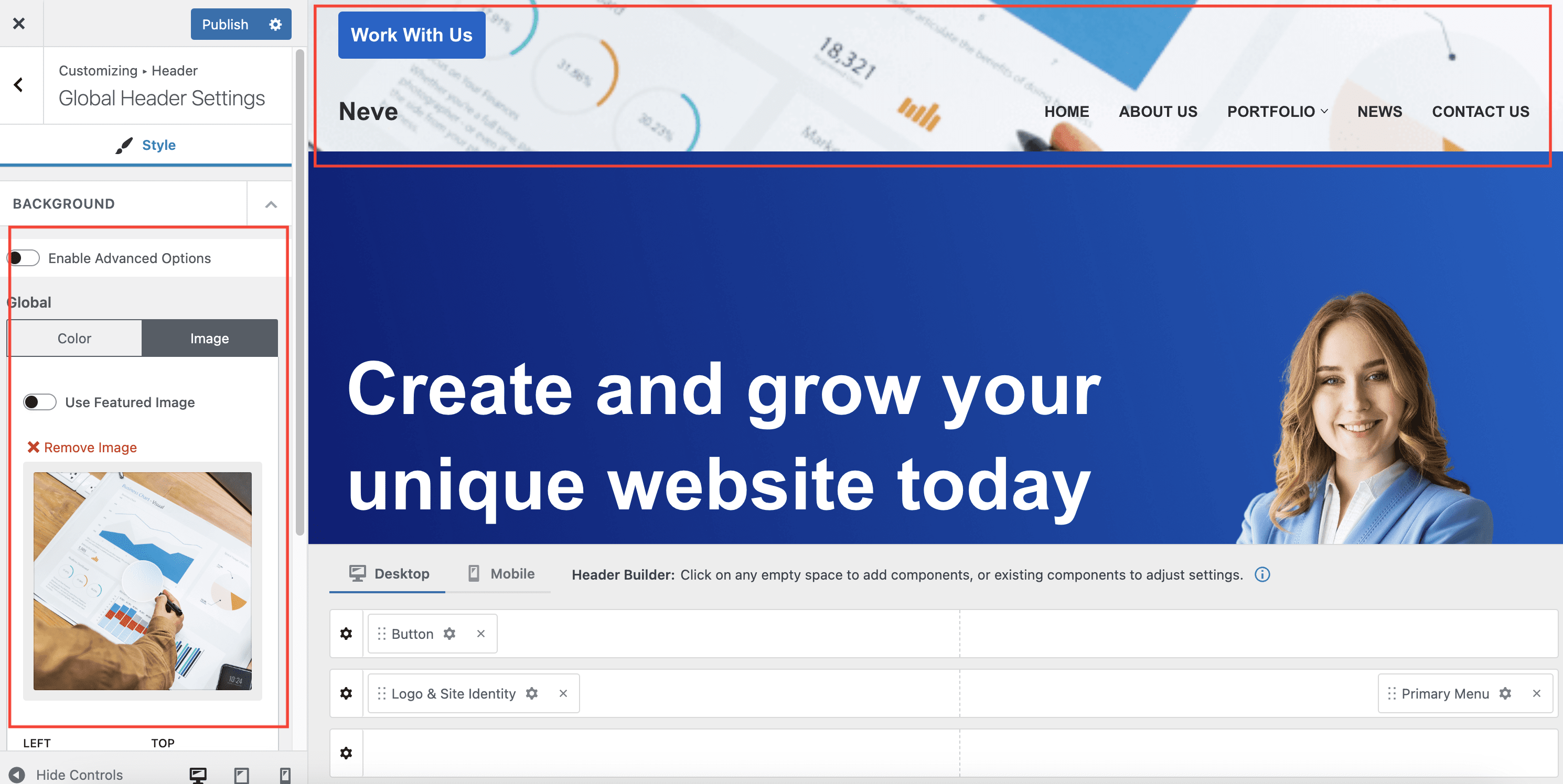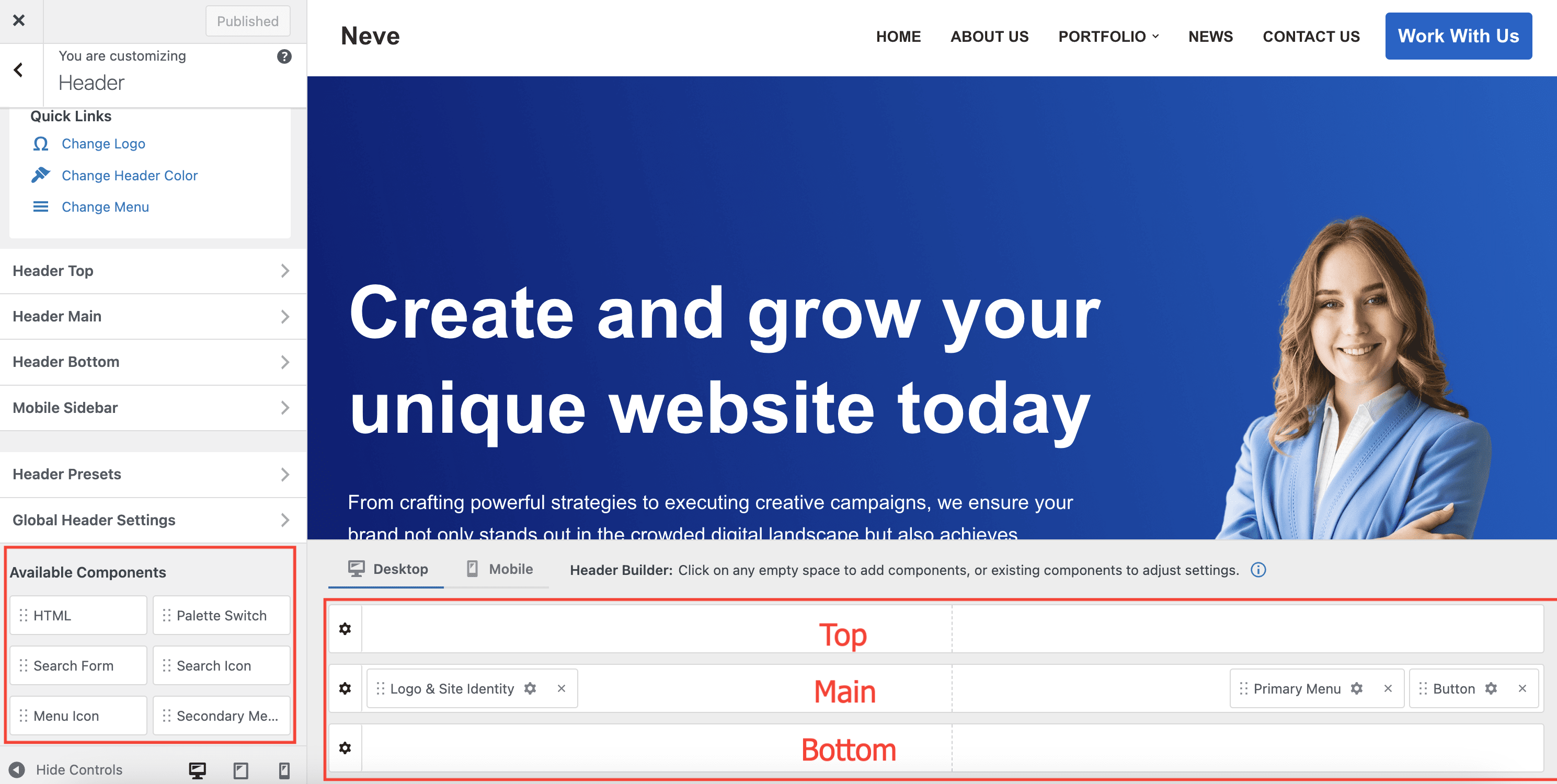 💡 Need a different component for the header/footer? Need to use a component multiple times? Check out the list of extra components available in Neve PRO.
