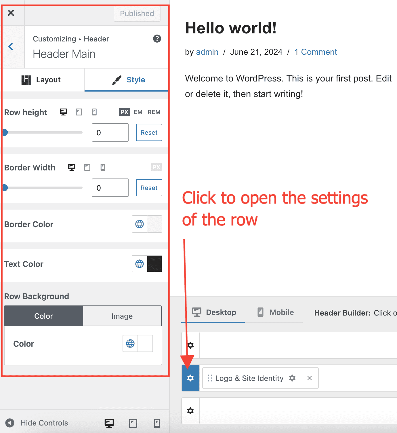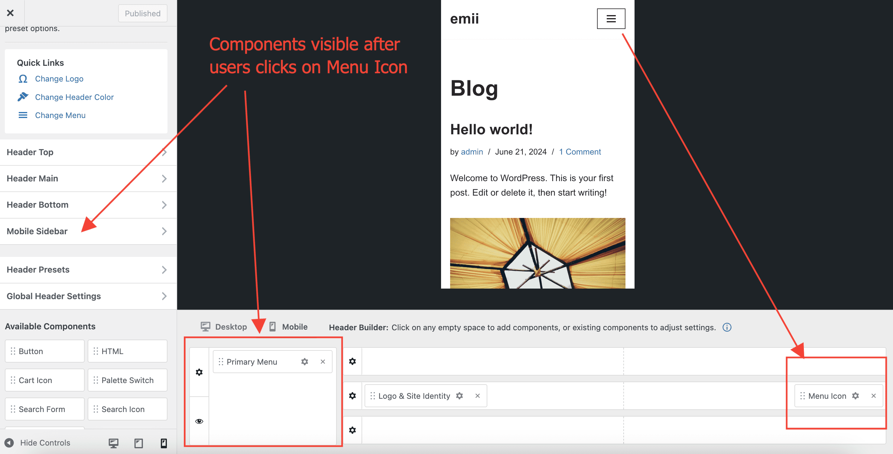 Meaning, that if the Menu Icon component is part of any of the three rows, once clicked, it will show up any content available in the Mobile Sidebar area. ( Typically, users add their Primary Menu component in the Mobile Sidebar area, in order for the users to see the main menu once they click on the menu icon, on mobile ).