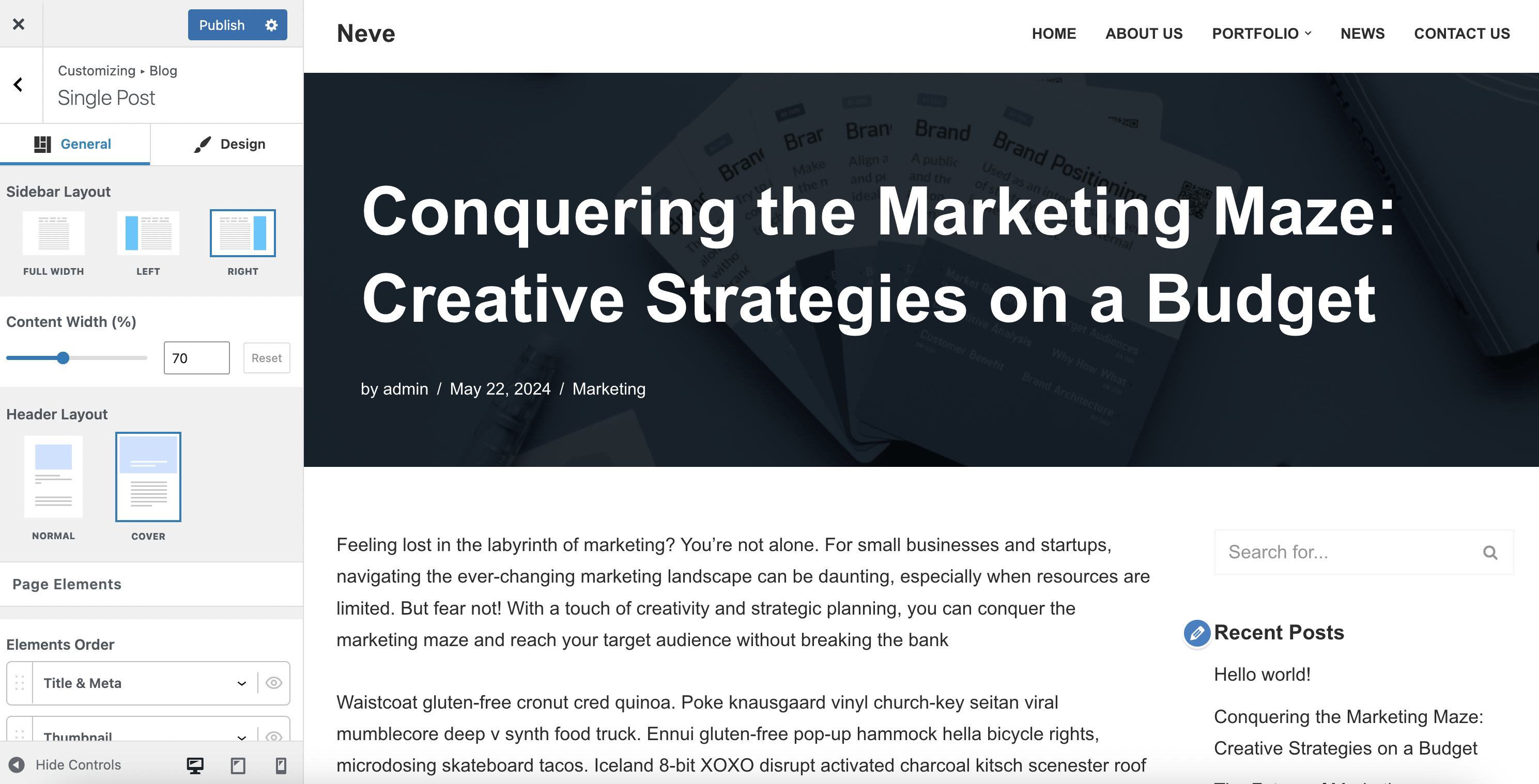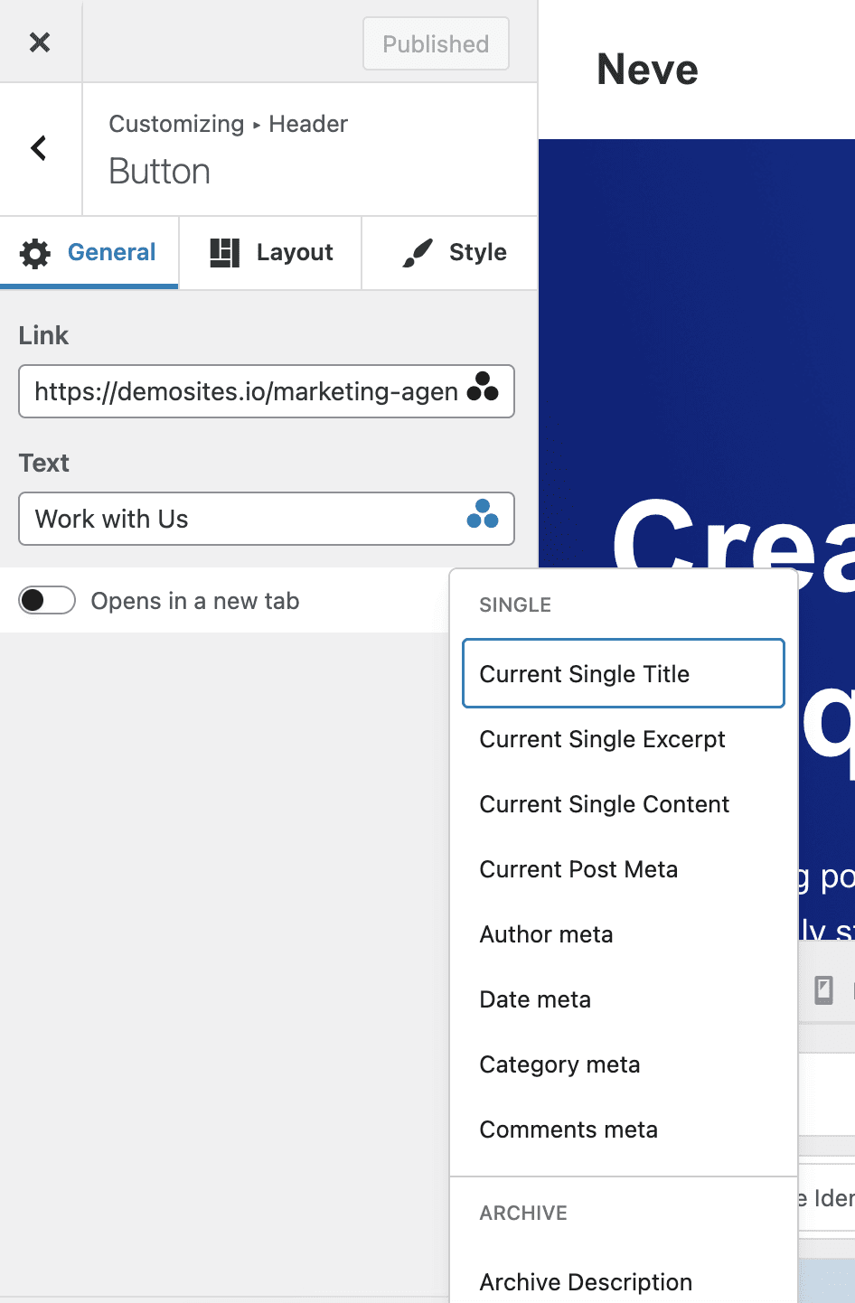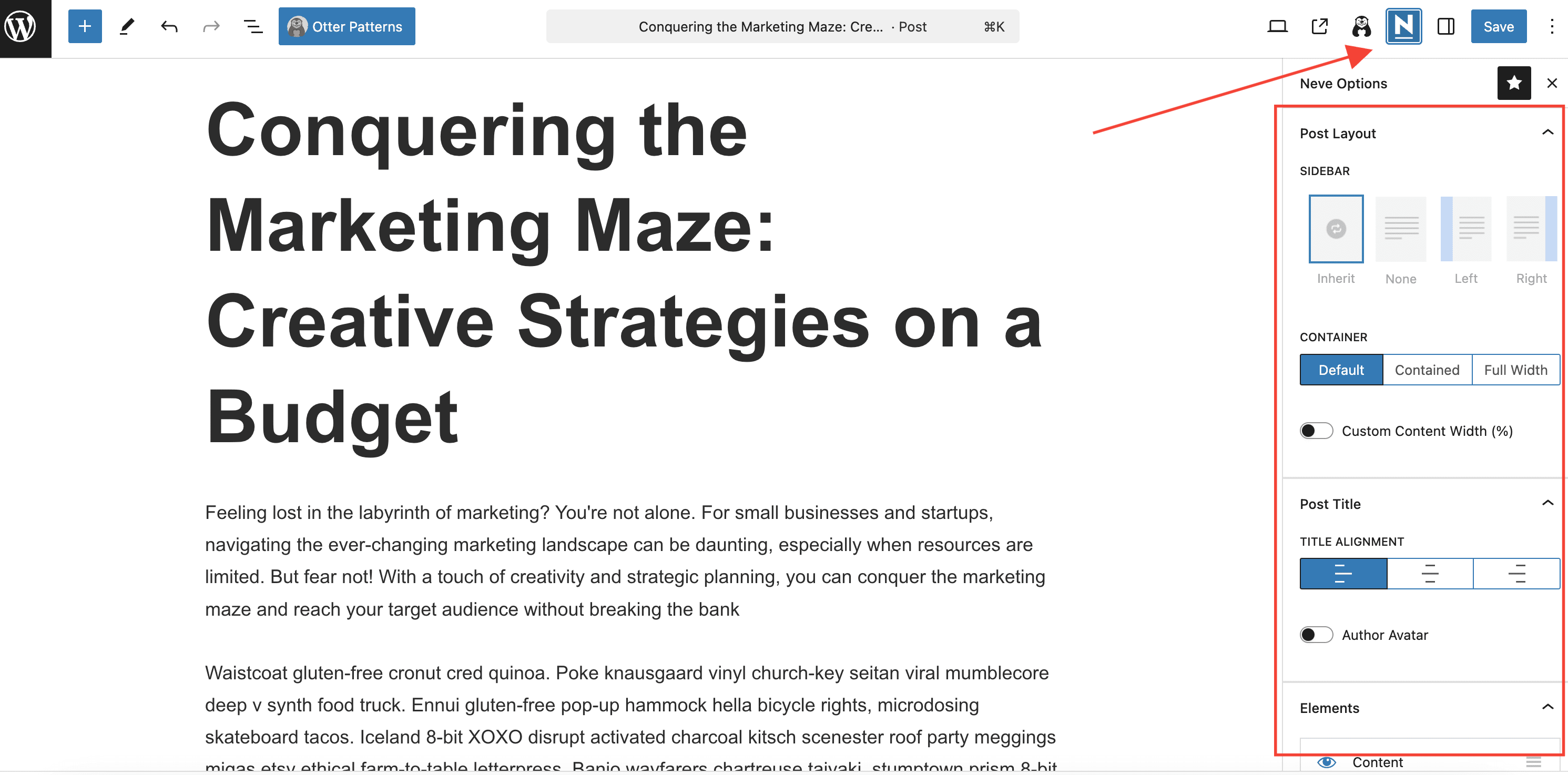 If needed, each post can have its own layout, overriding the general options set before. To obtain that, click on the Neve icon from the single post page, which will open a new panel of options.