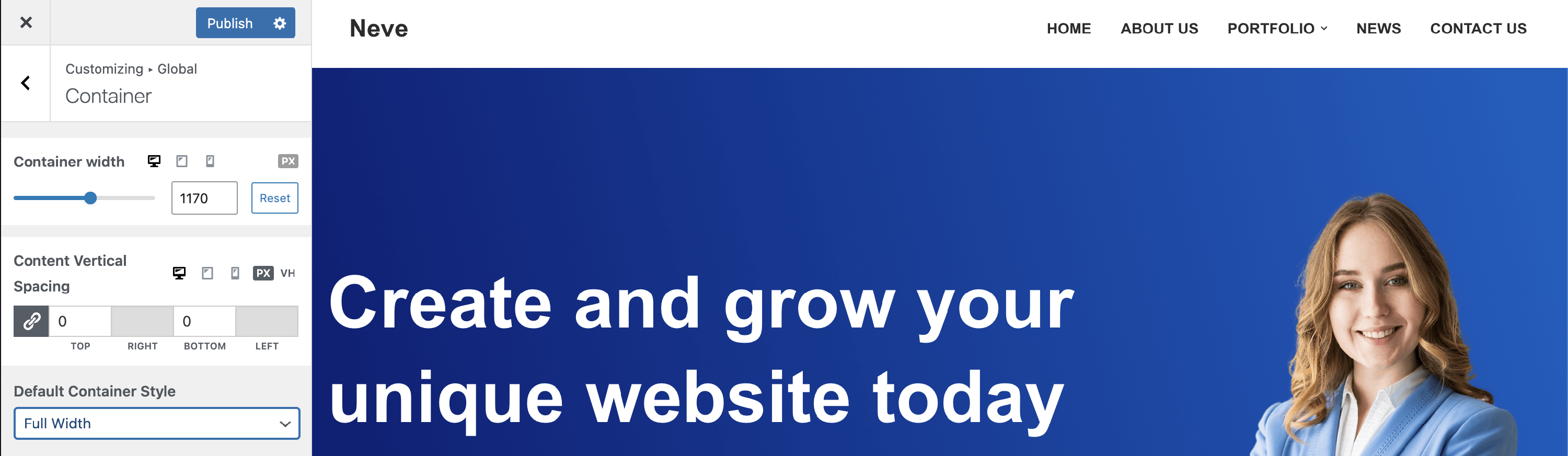 Content Width and Container Style are two related options. When choosing a Contained style, the content of the page will stay inside the corresponding Content Width, while Full Width means that the content of the page will spread the entire area.