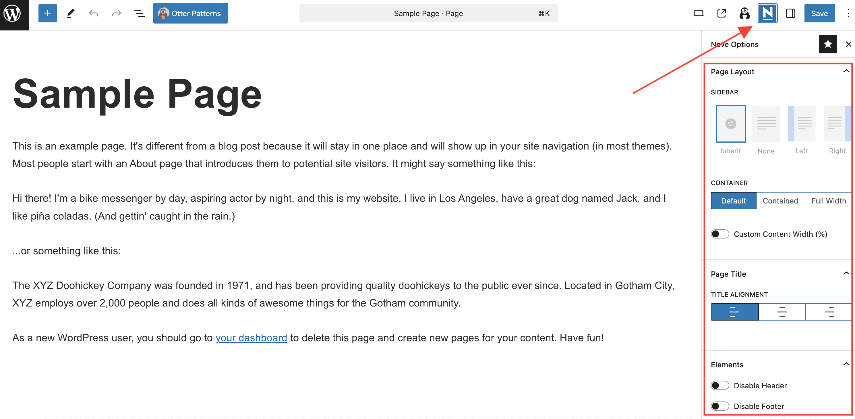 If needed, each page can have its own layout, overriding the general options set before. To obtain that, click on the Neve icon from the single page, which will open a new panel of options.