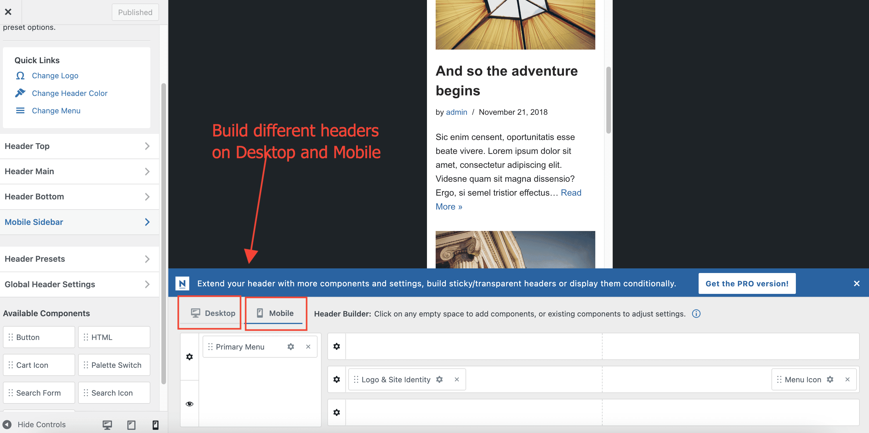 The header and footer builders allows for two different headers/footers on Desktop and on mobile devices ( any device with the width lower than 960px).