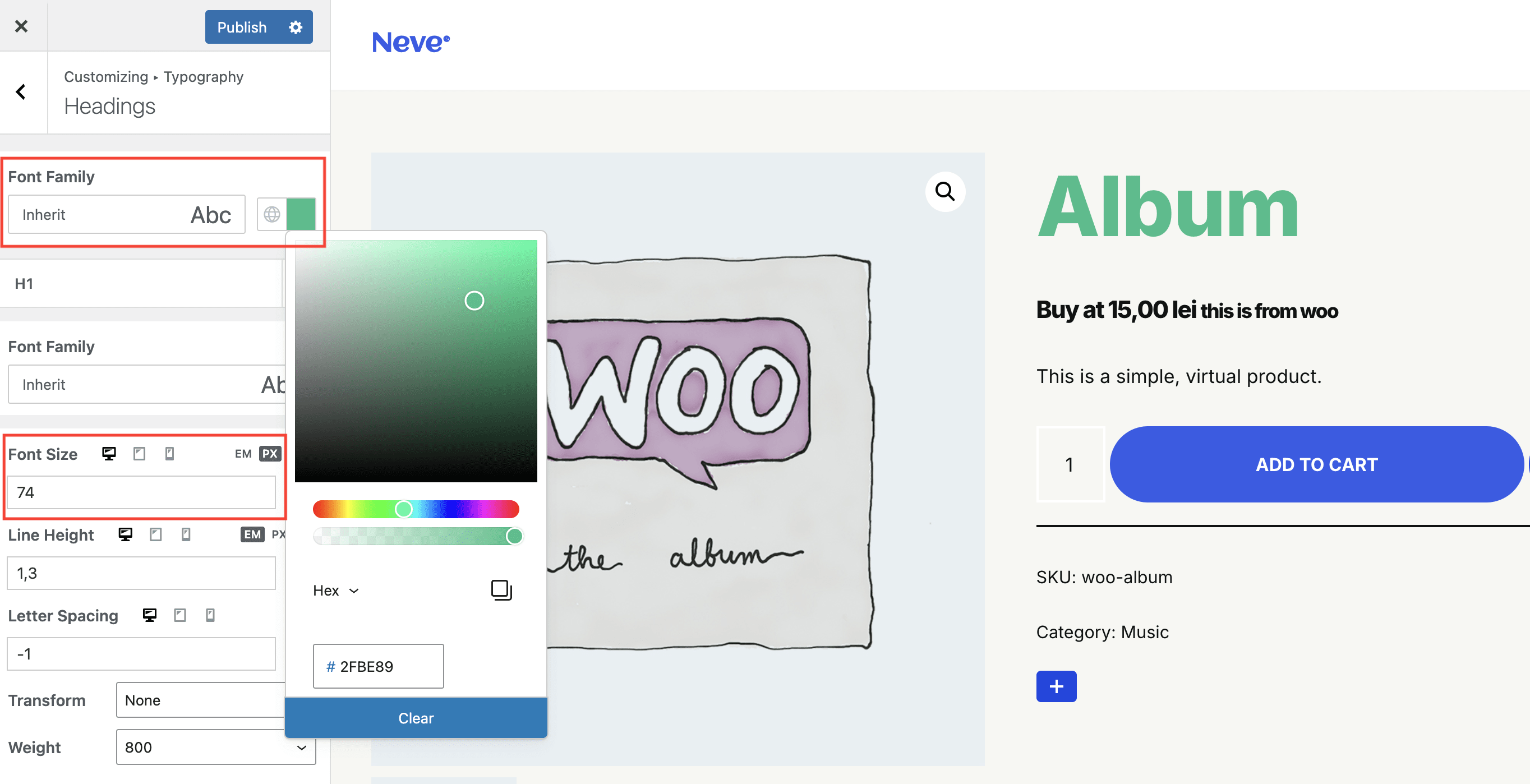 The Typography options available in Neve are spread across two panels: General, Headings and WooCommerce (if the WooCommerce plugin is installed).