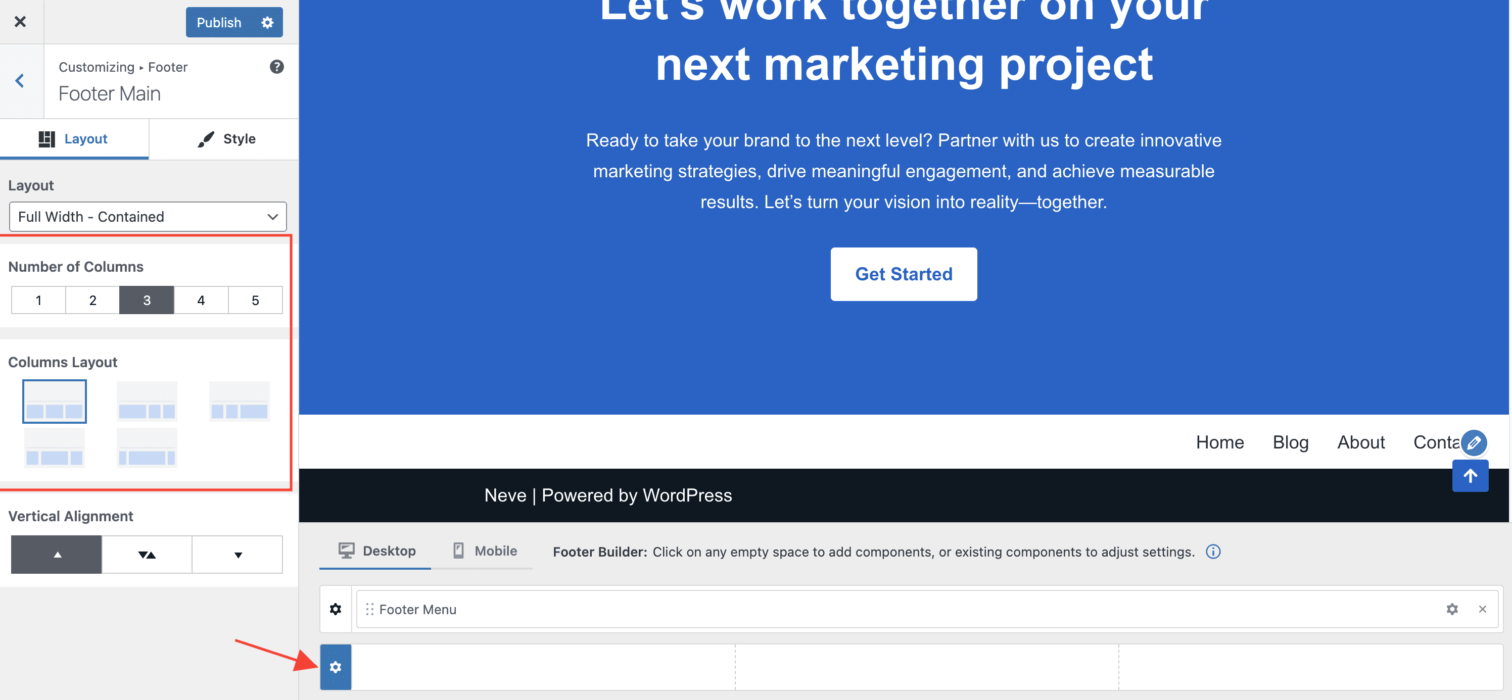 For each of the three rows of the footer, there is an option to choose a different number of columns, with a specific layout.