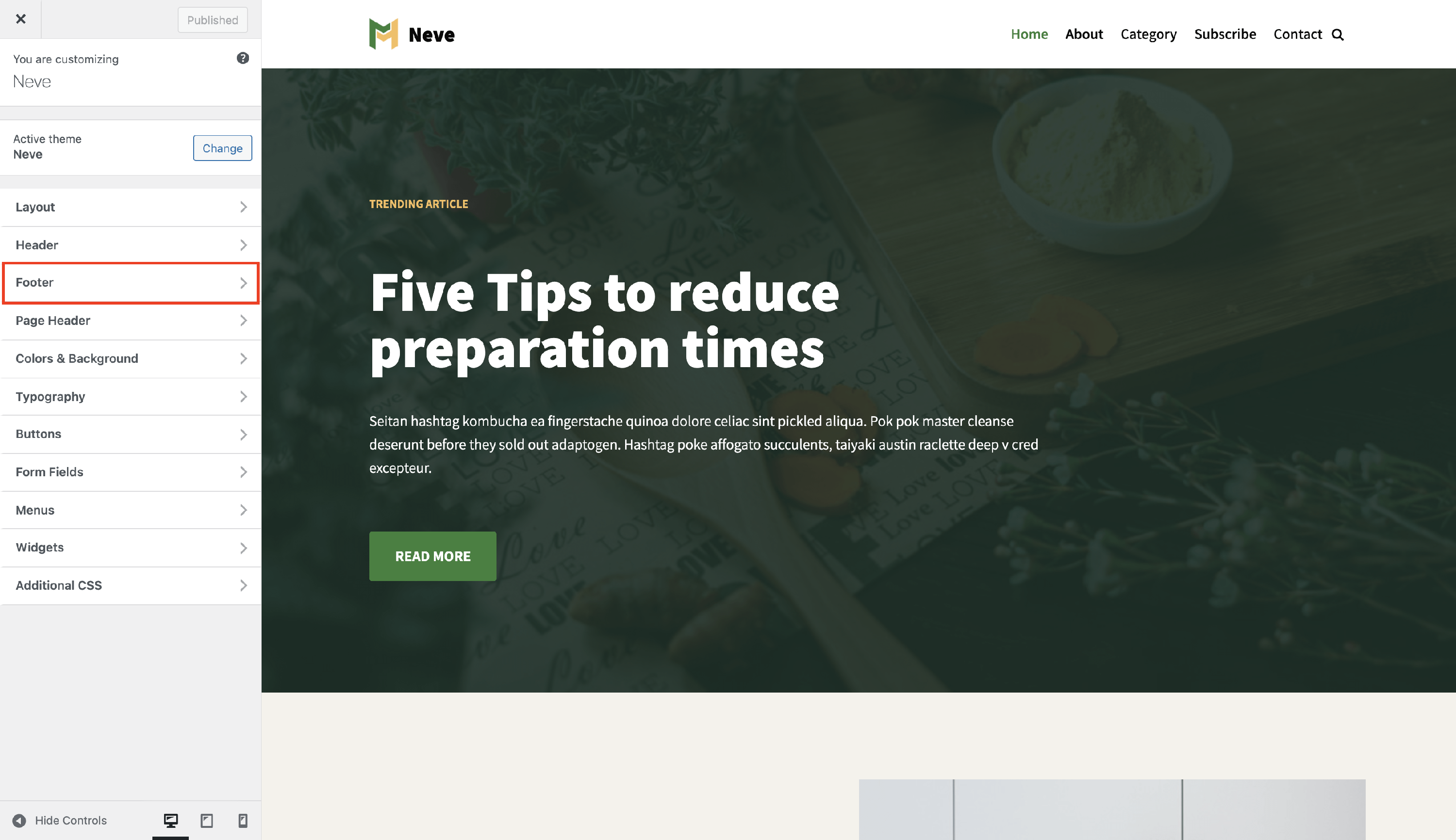 1 Navigate to Neve > Customize.