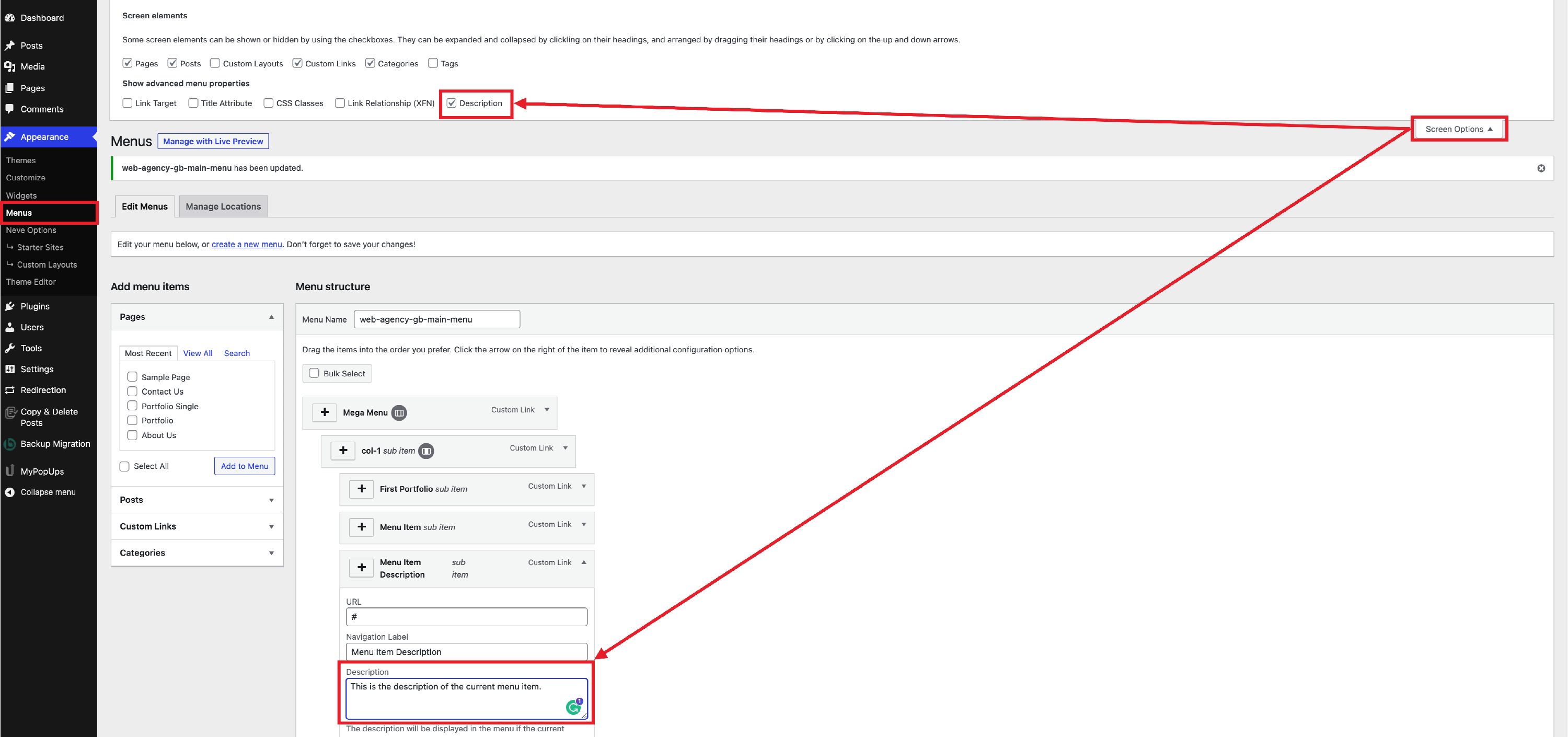 The second method of displaying a menu item description is without using any settings related to the Mega Menu of Neve, which will display the description below the menu item title. In order to make this work, just enable the Description checkbox in the Screen Options as in the following screenshot.