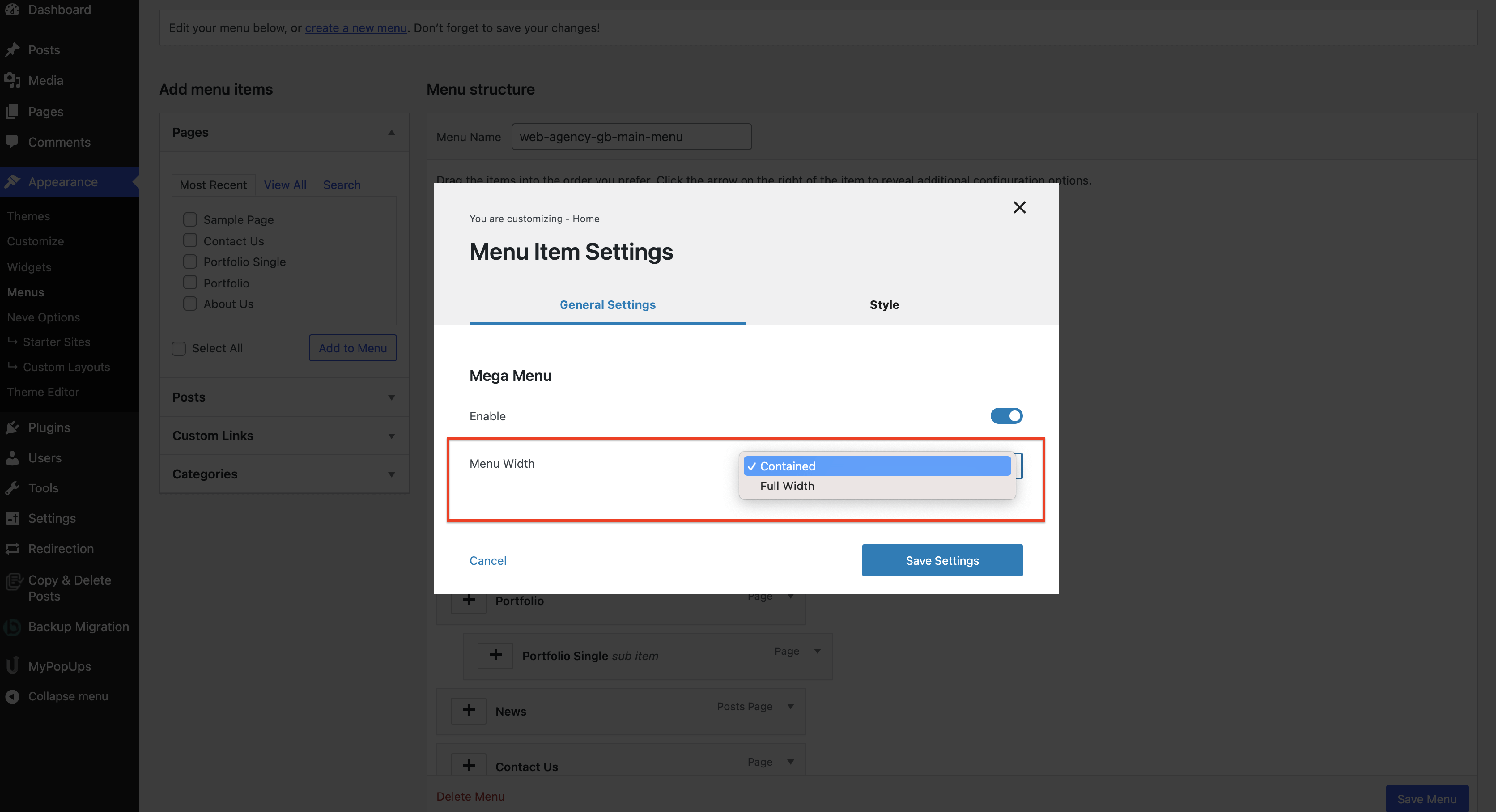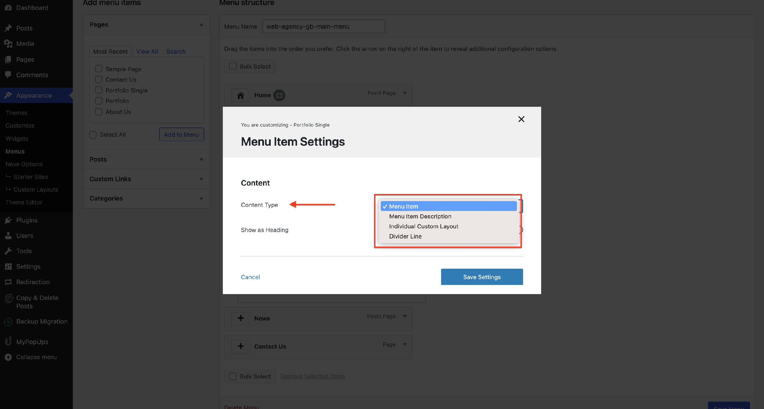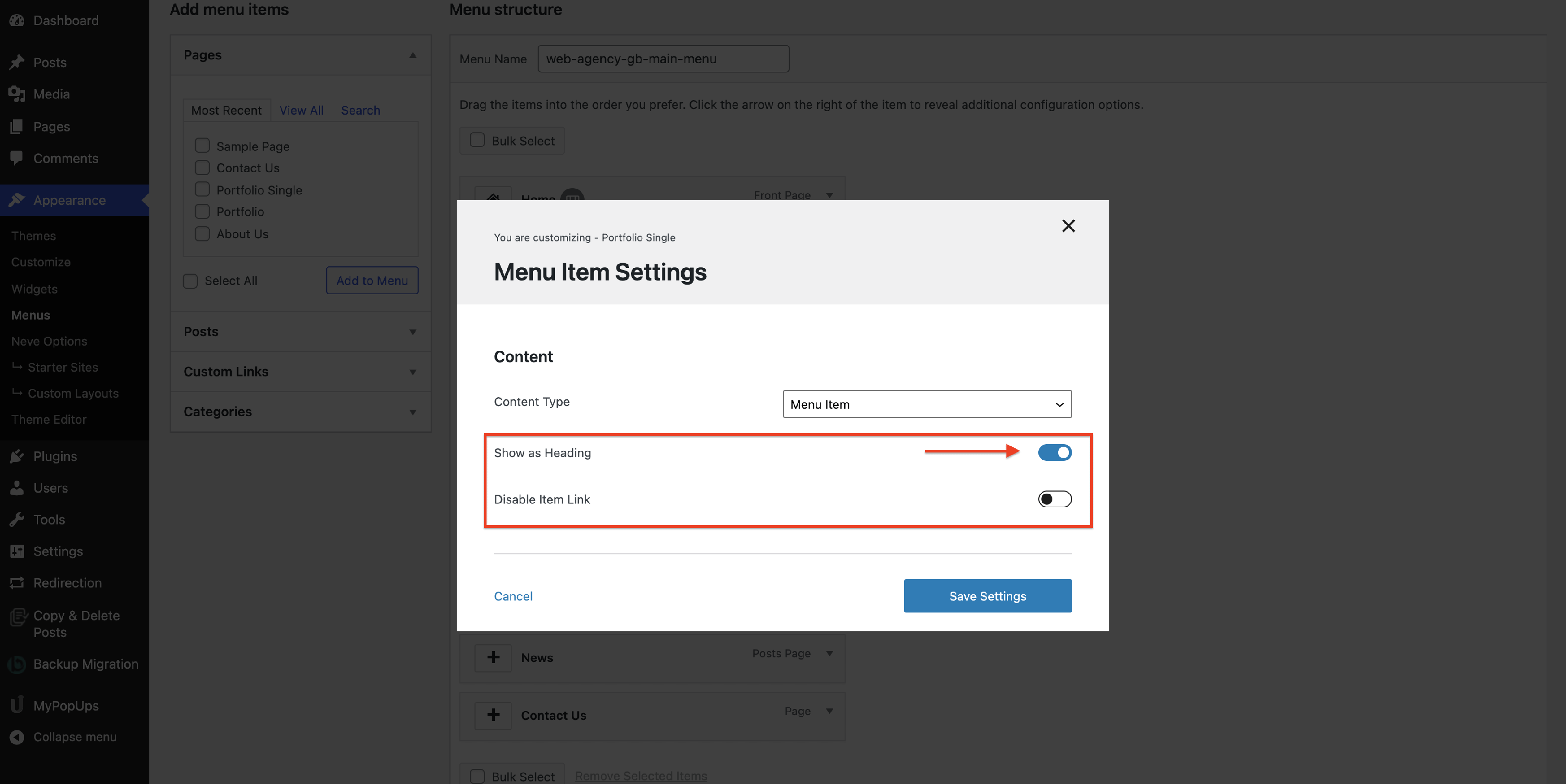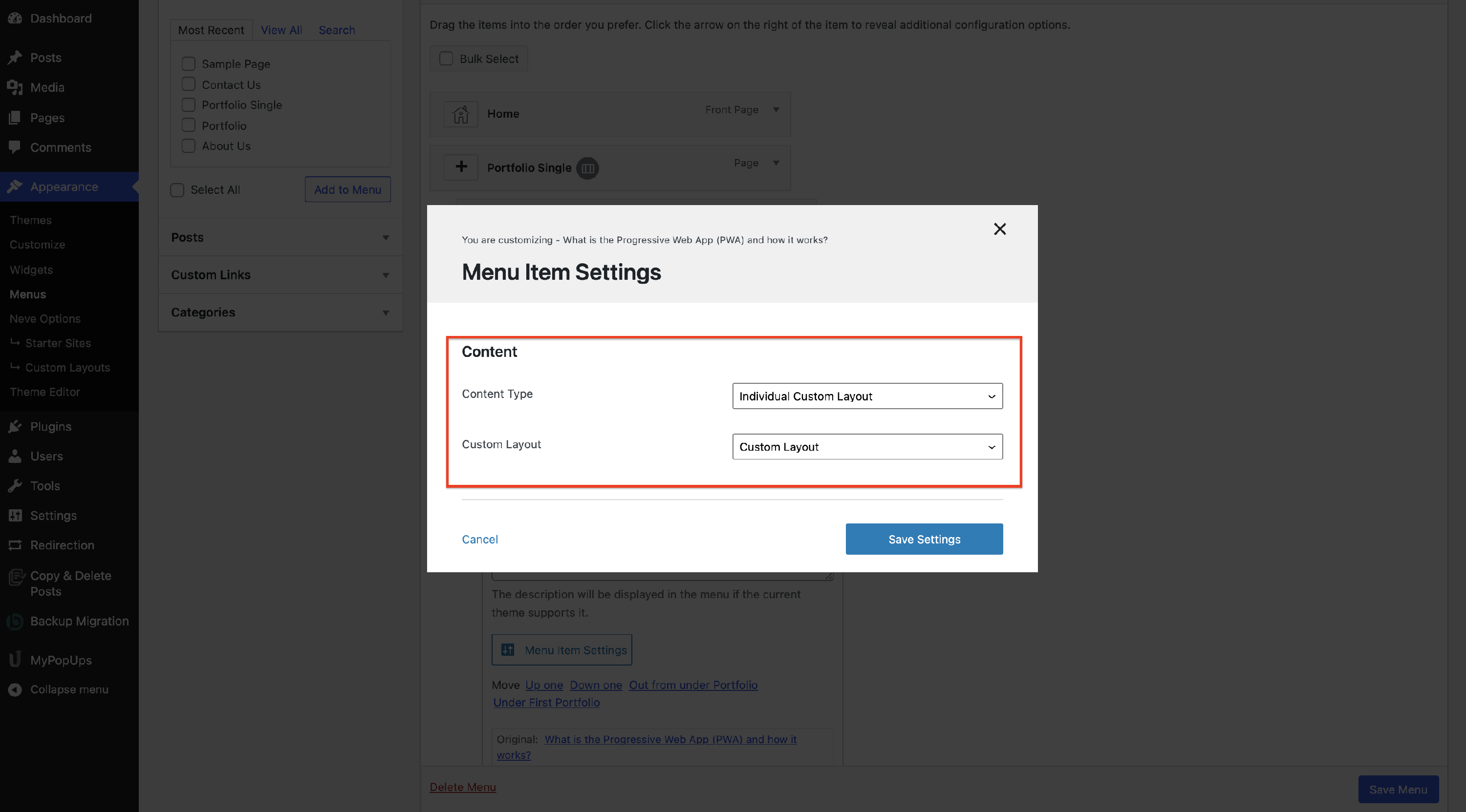 The Menu Item Settings will open a modal with options.