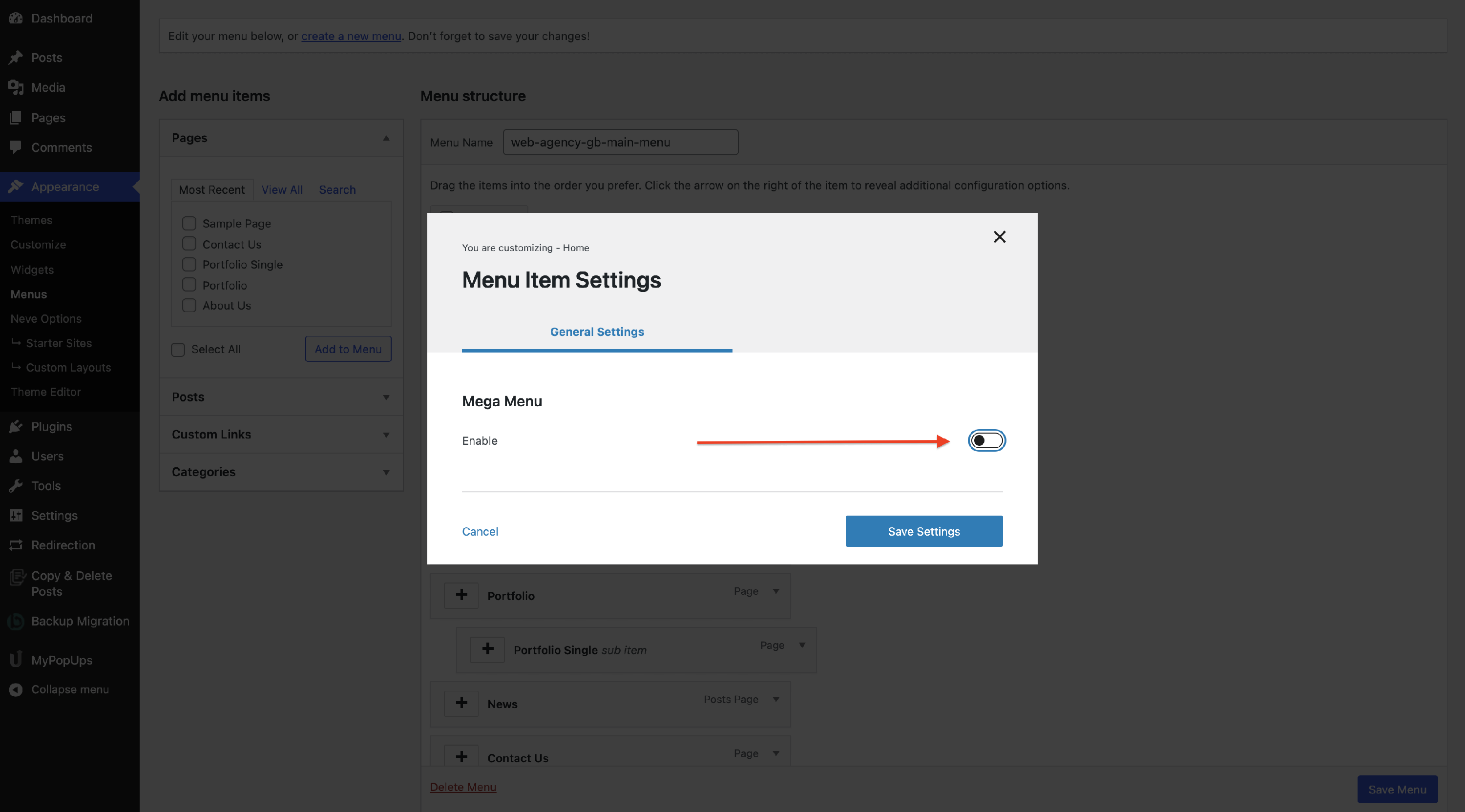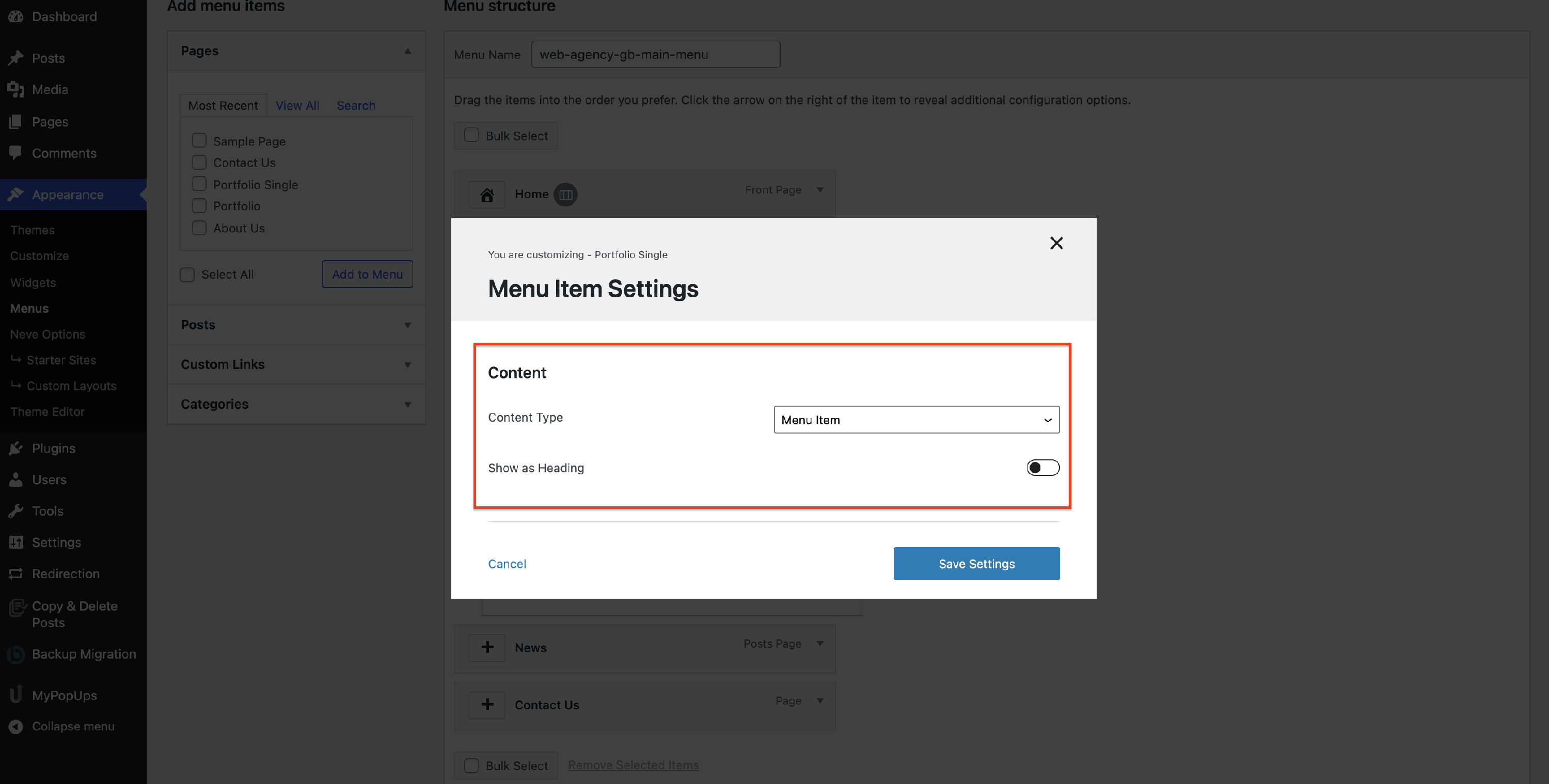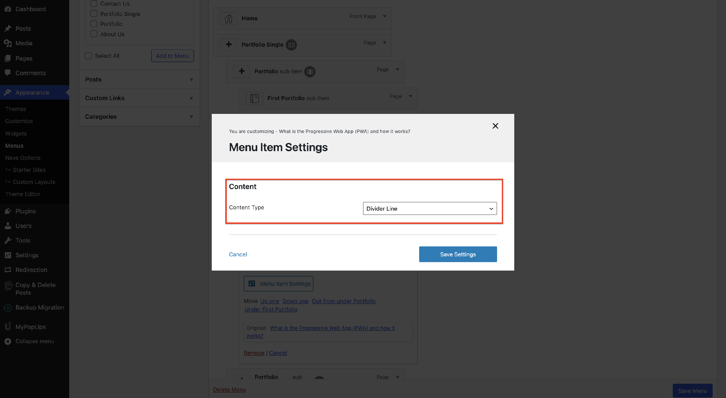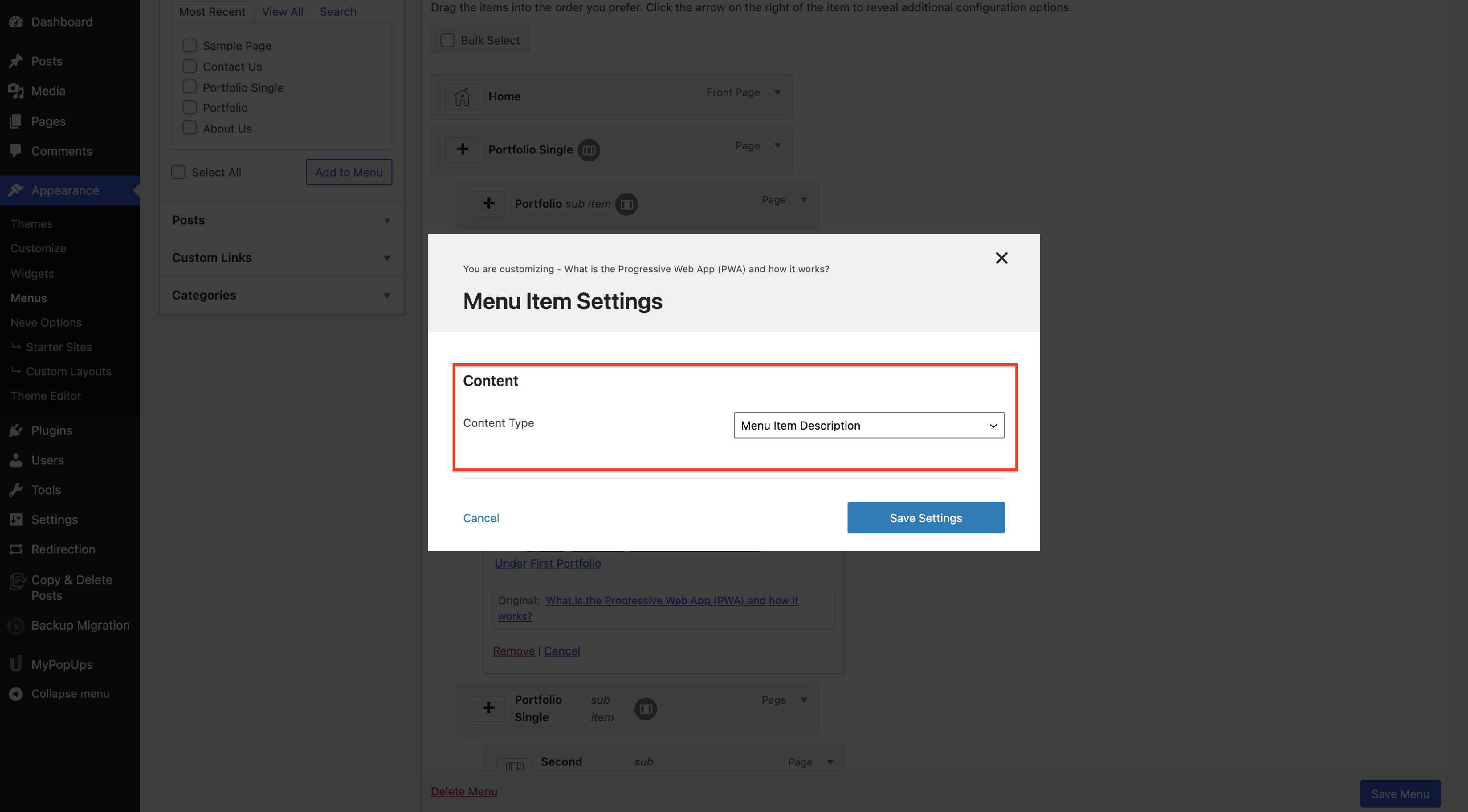 The Menu Item Settings will open a modal with options.
