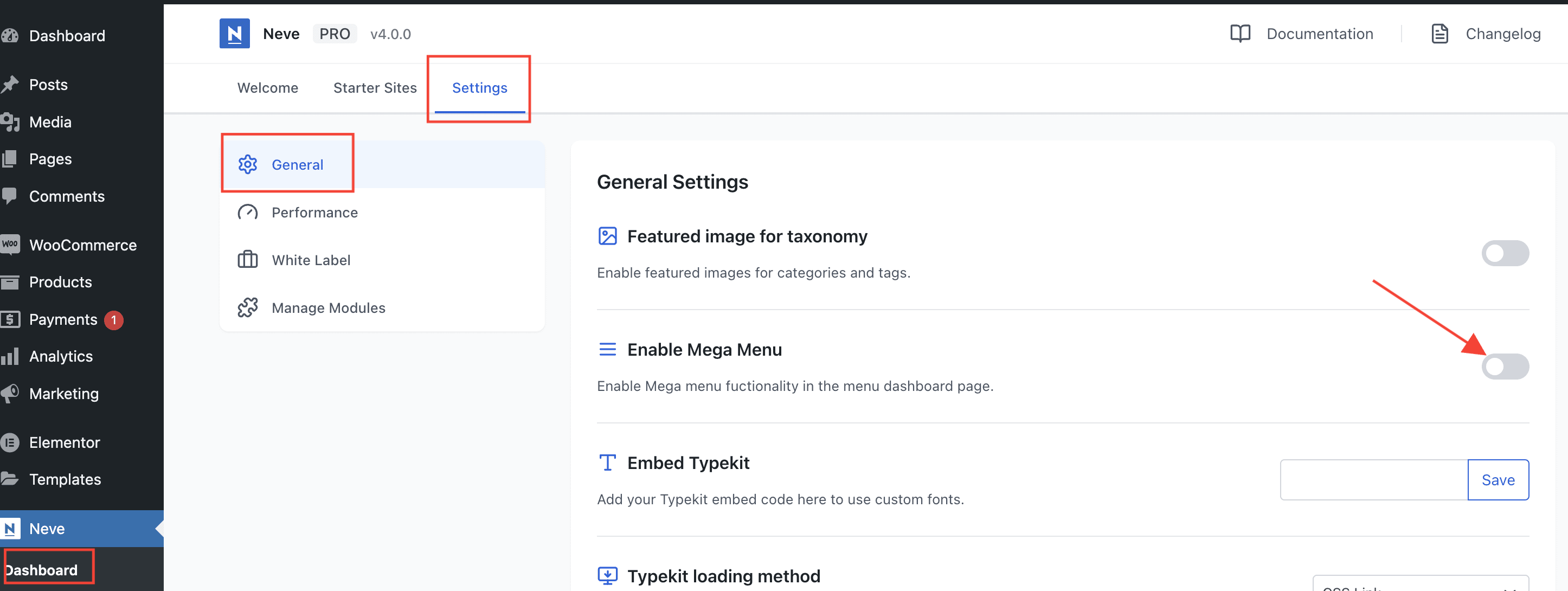 2 Navigate to Neve > Dashboard > Settings.