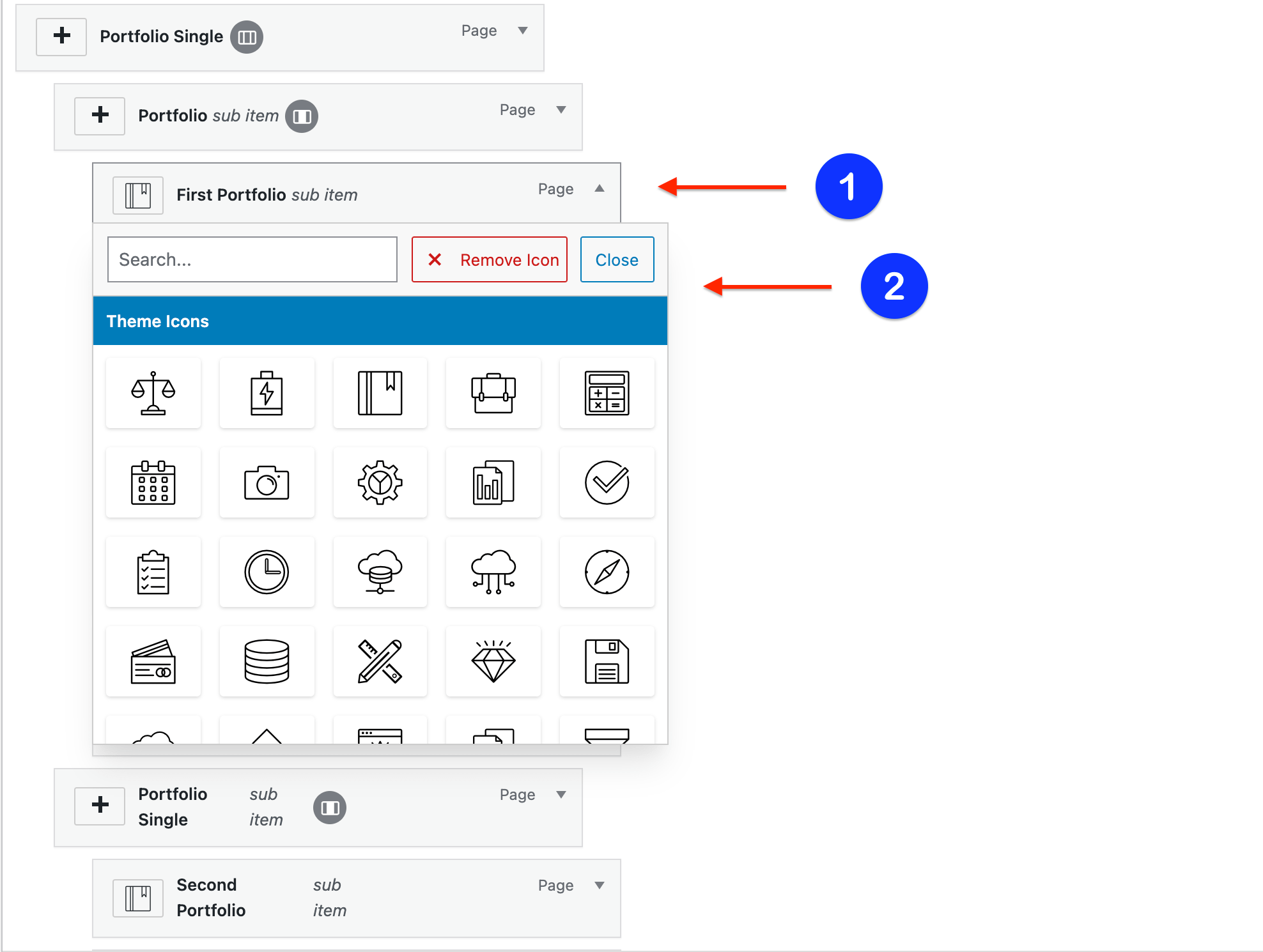 One of the most interesting facts about the Mega Menu is that you can easily insert icons for the menu items, by clicking on the ➕ button, next to the name of the item.