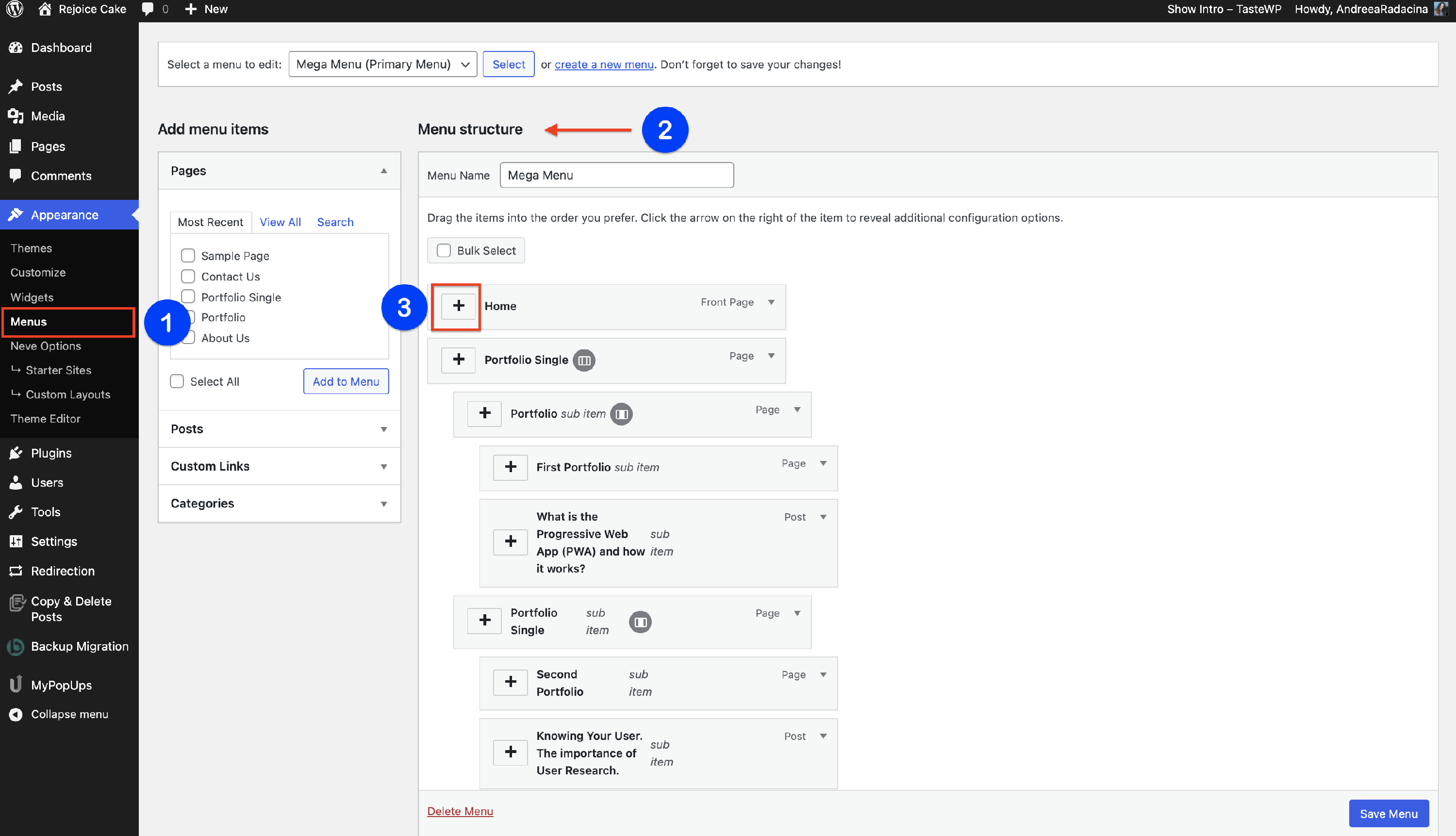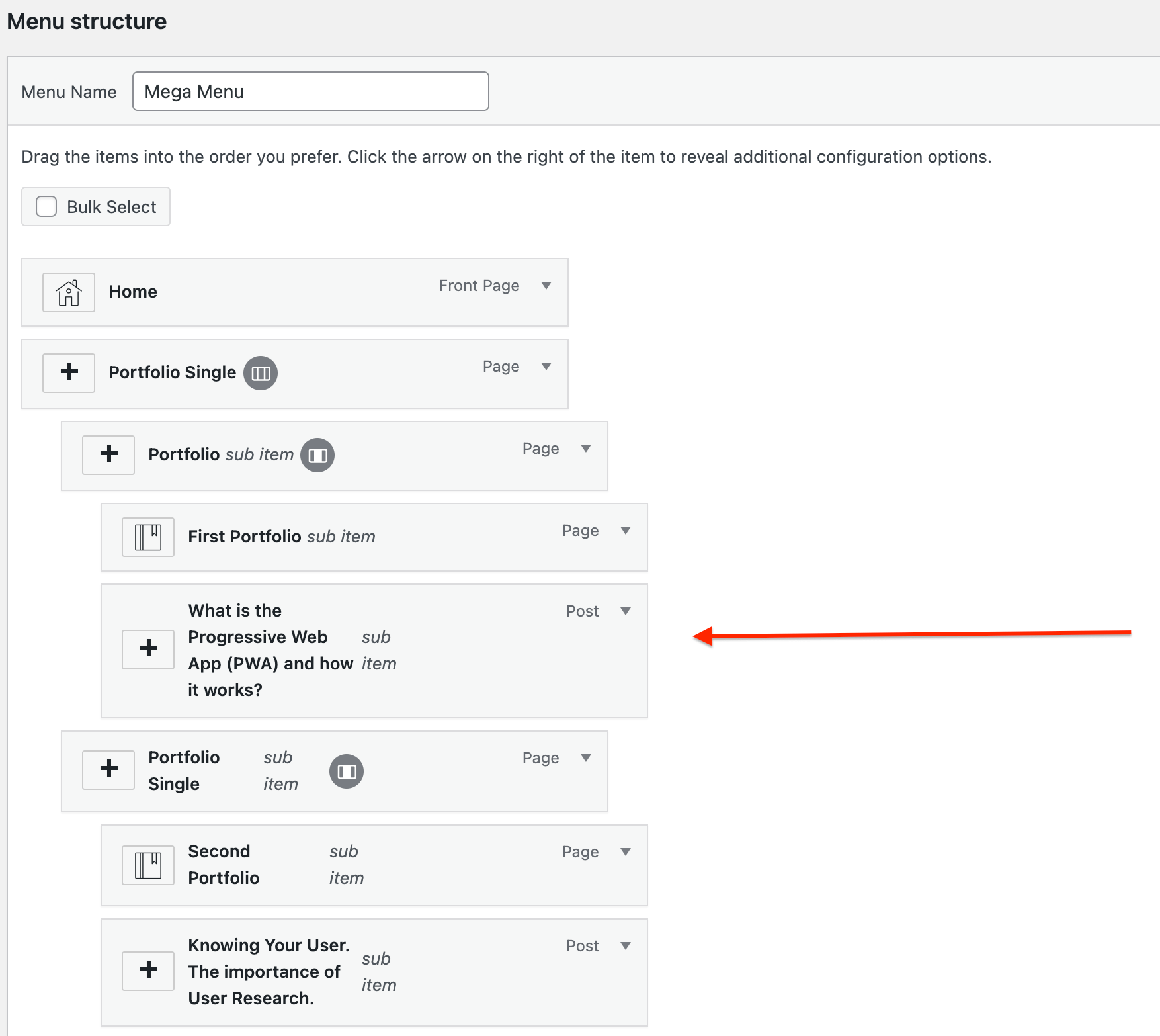 Click on the 🔽button of any menu item and a button with Menu Item Settings will appear.