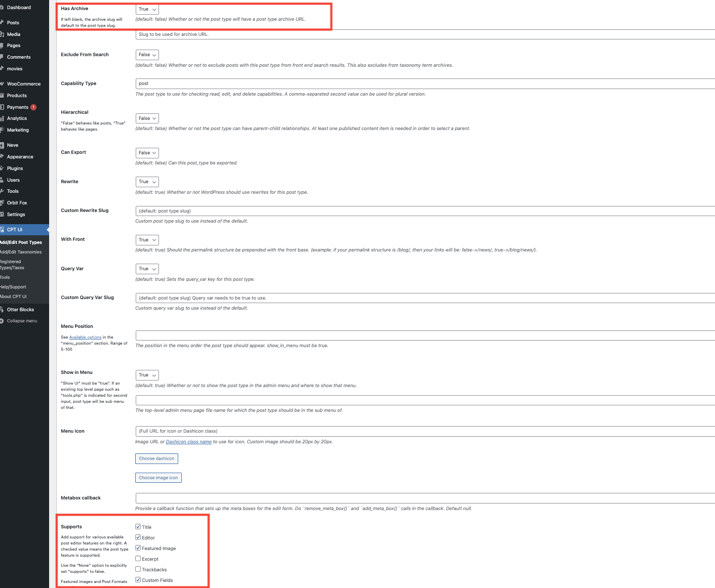 2. When creating the CPT, make sure to mark Custom Fields as supported, and Has Archive is marked as True.