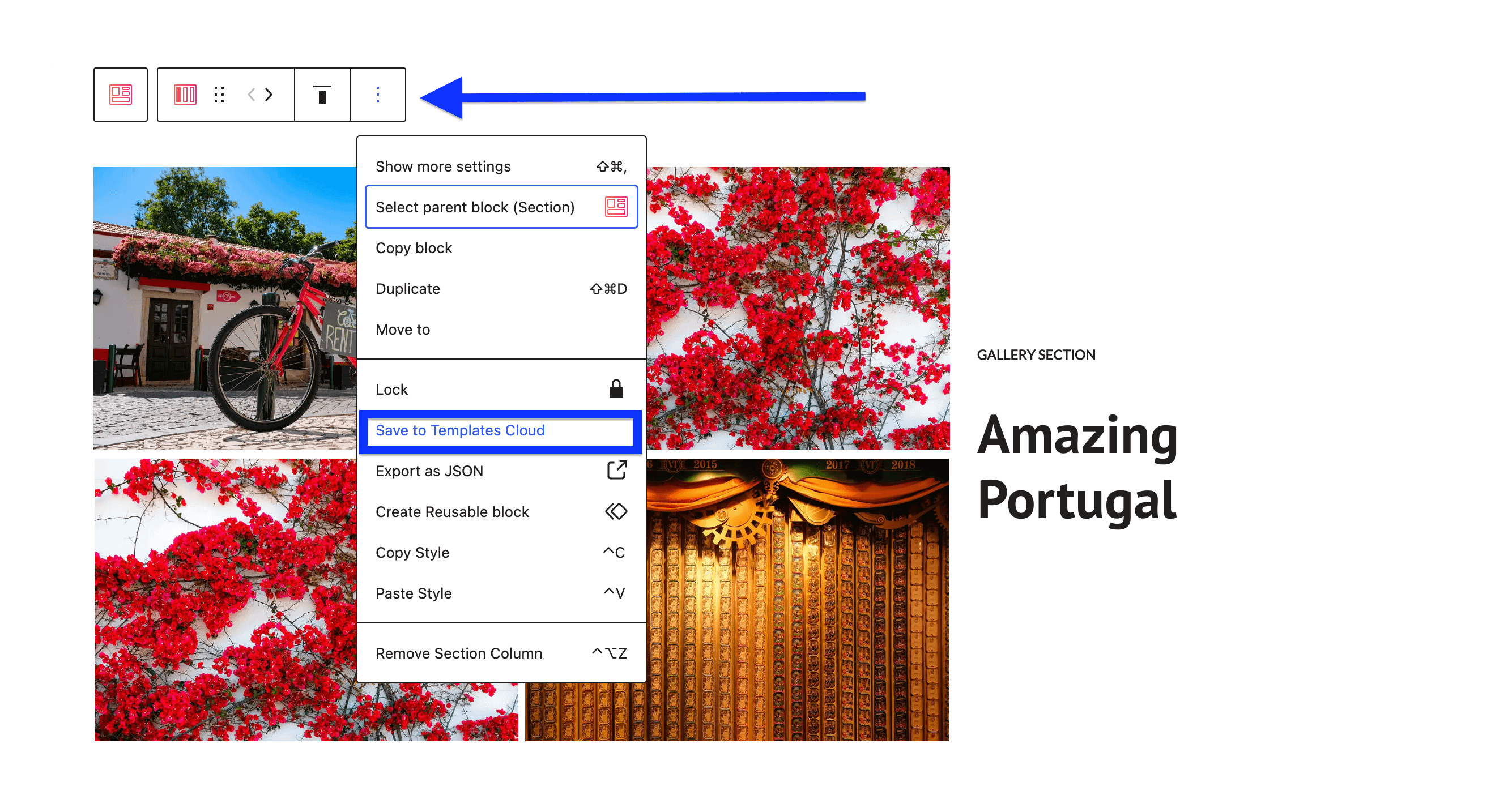 It is also possible to save just a block to the library by selecting it, clicking on the three dots, and choosing Save to Templates Cloud.