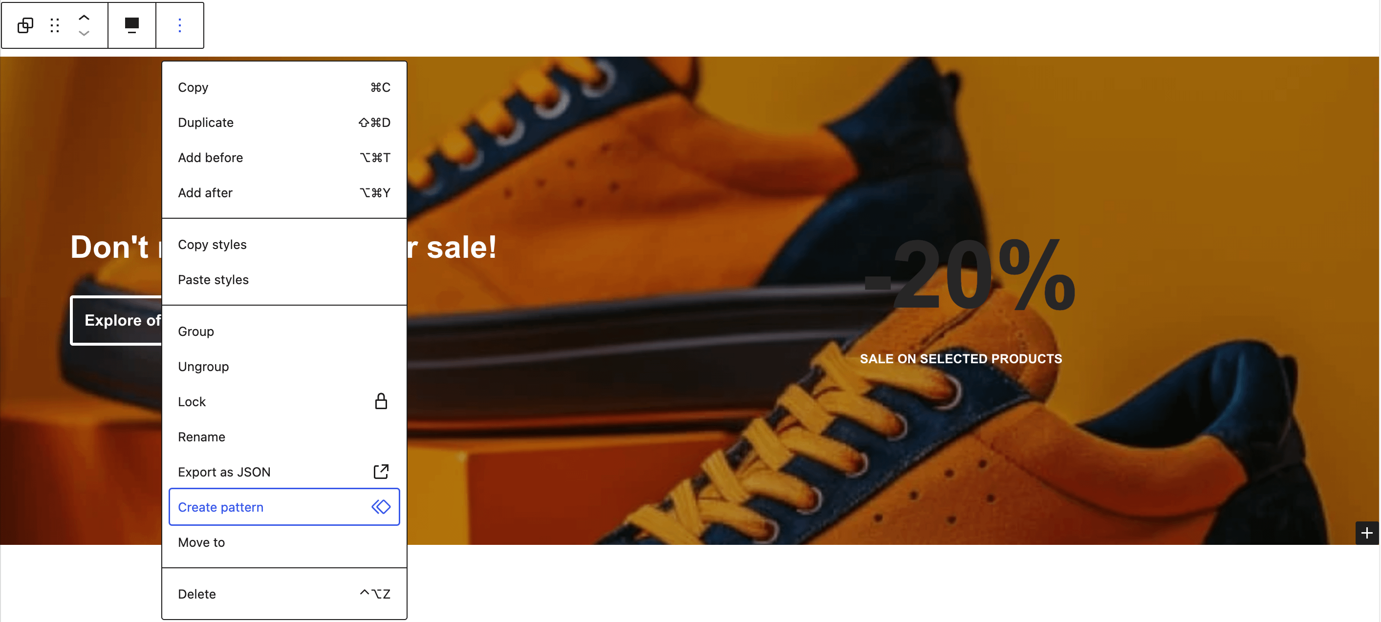 To save an individual block or section to the library, simply select the block, click on the three dots, and choose the Create pattern button.
