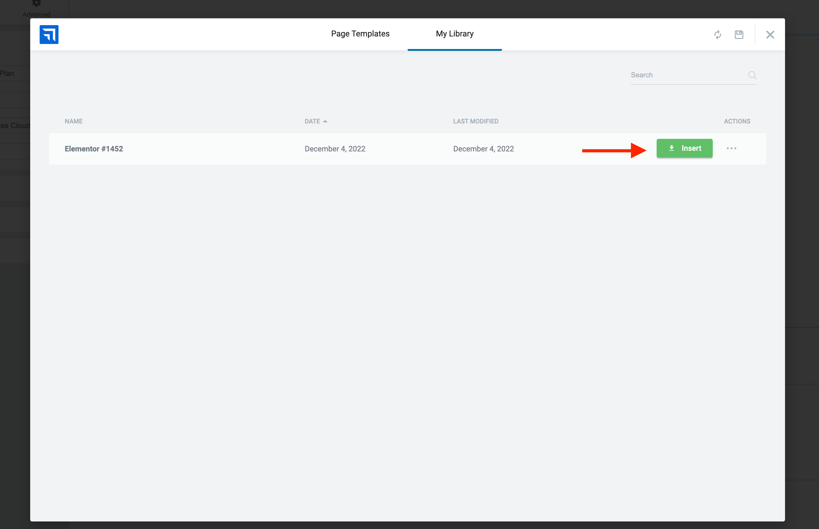 You will notice the template created in the My Library tab. All you have to do is to navigate to the page where you want to use the template and click on the Insert button.