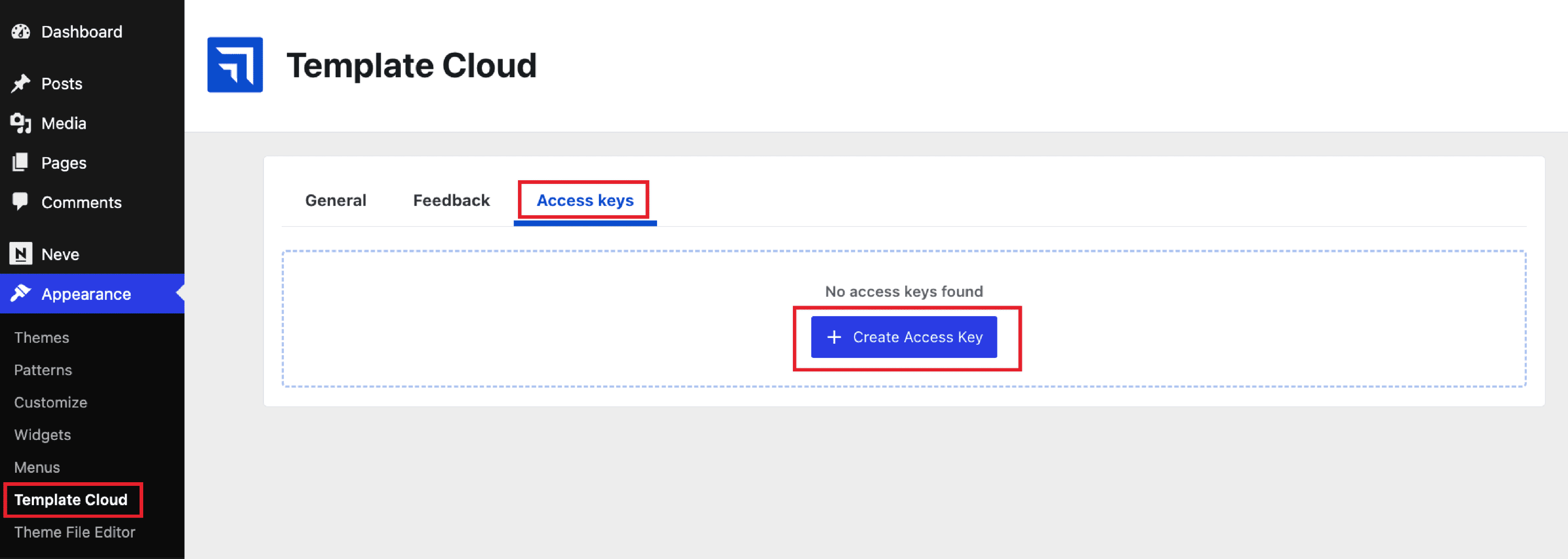 To create your Access keys, please navigate to Appearance > Template Cloud > Access Keys