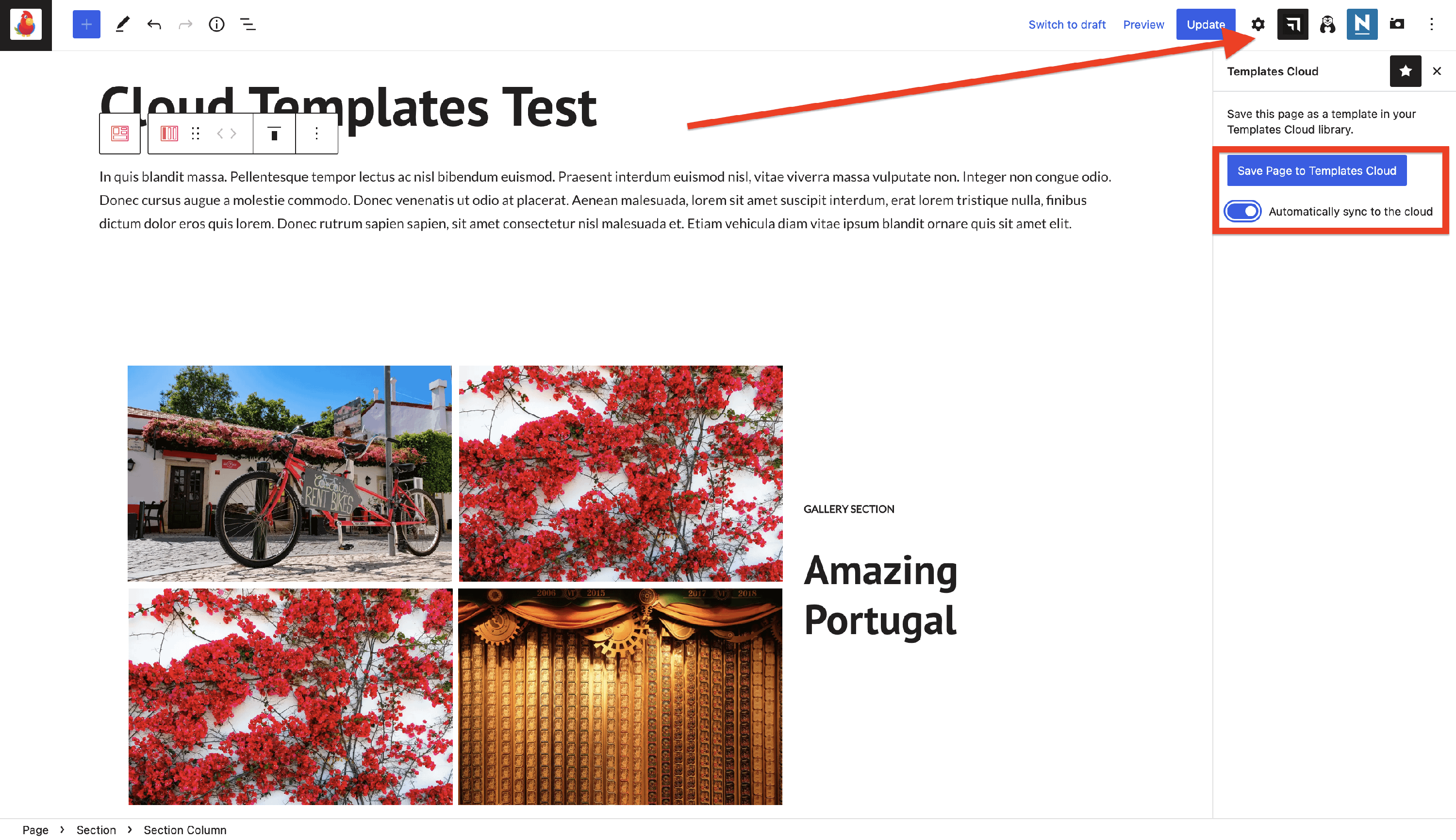 A page or post can be saved to the cloud when accessed with the WordPress default editor ( Gutenberg ) by clicking on the Cloud Templates logo at the top of the right sidebar and clicking on the Save to Templates Cloud button.