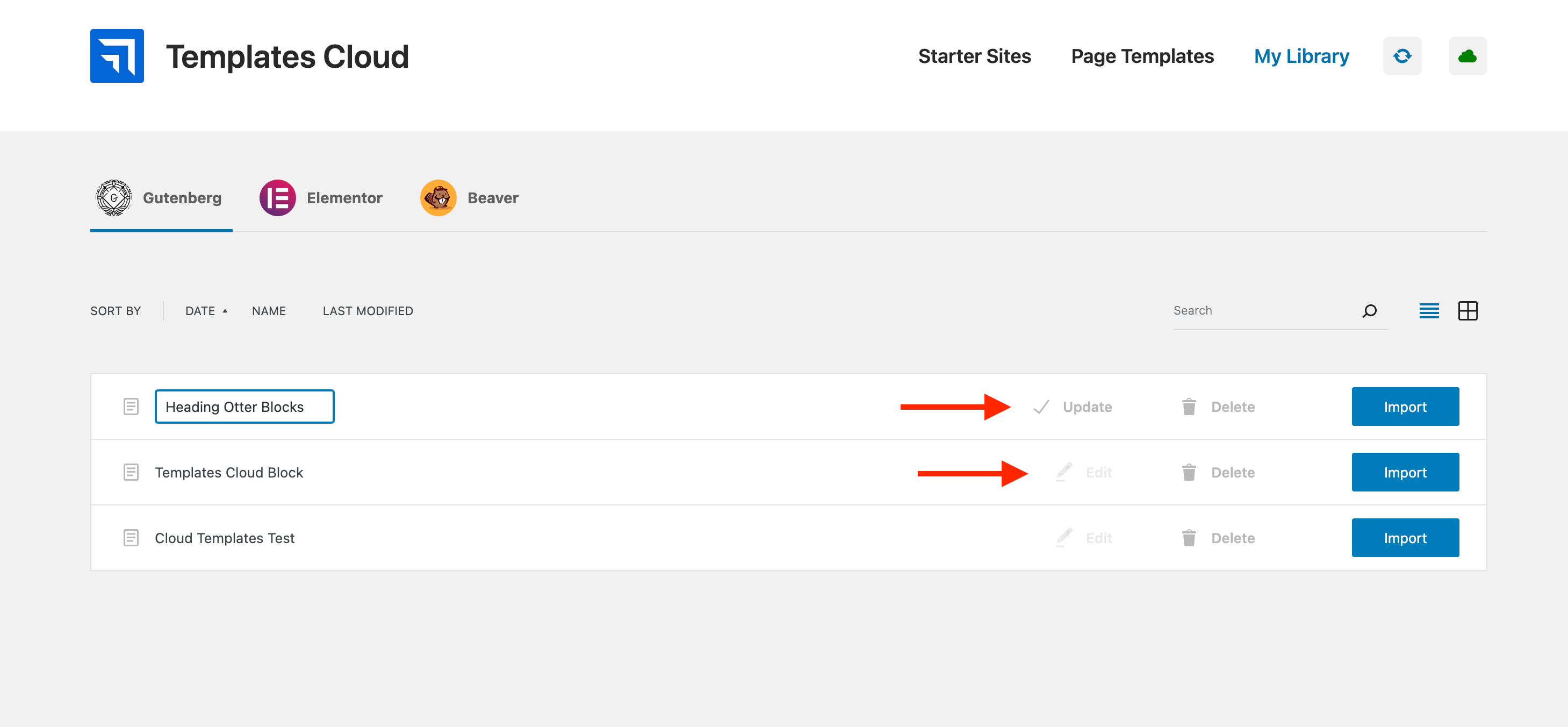 The templates can be managed in Dashboard > Appearance > My Library. From here, it is possible to import them on a newly created page, change their names, and delete them.