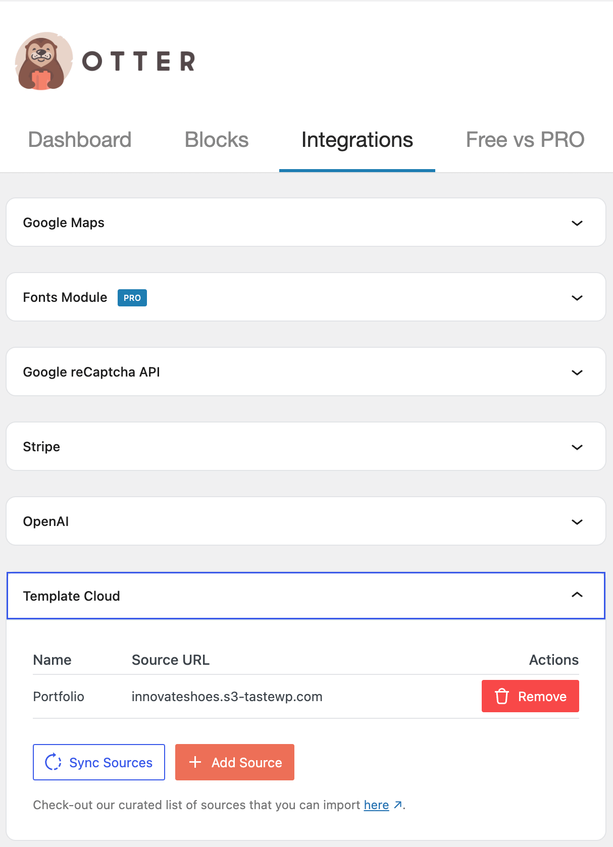 With the Otter Blocks plugin, go to the Settings page, navigate to the Integrations tab, and locate the Template Cloud section. Add a source by entering the API URL and Access Key. The patterns shared via this key will then be available directly in the editor under the Patterns tab.