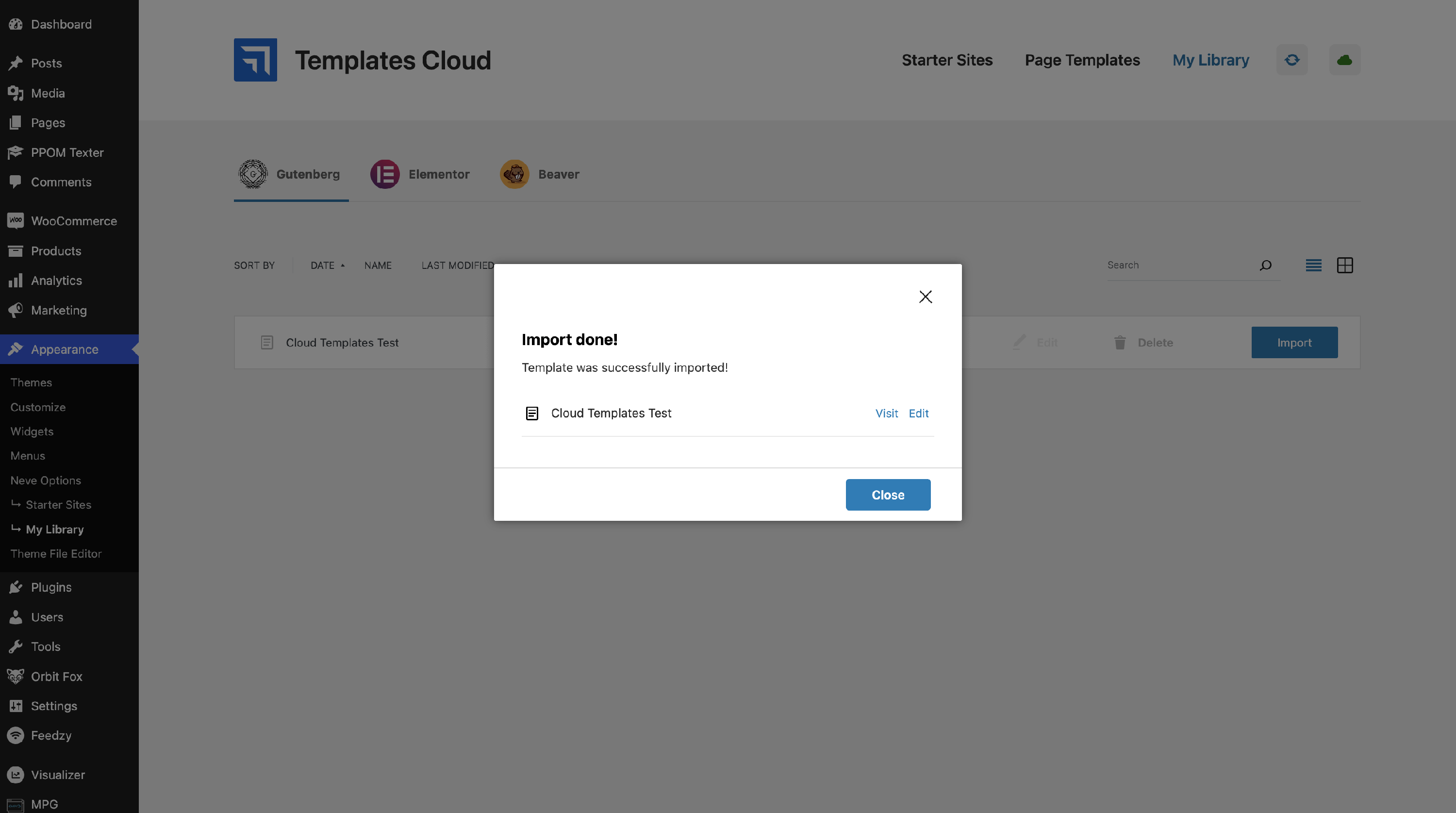 Templates can be imported from the library by accessing the page in Dashboard > Appearance > My Library.
