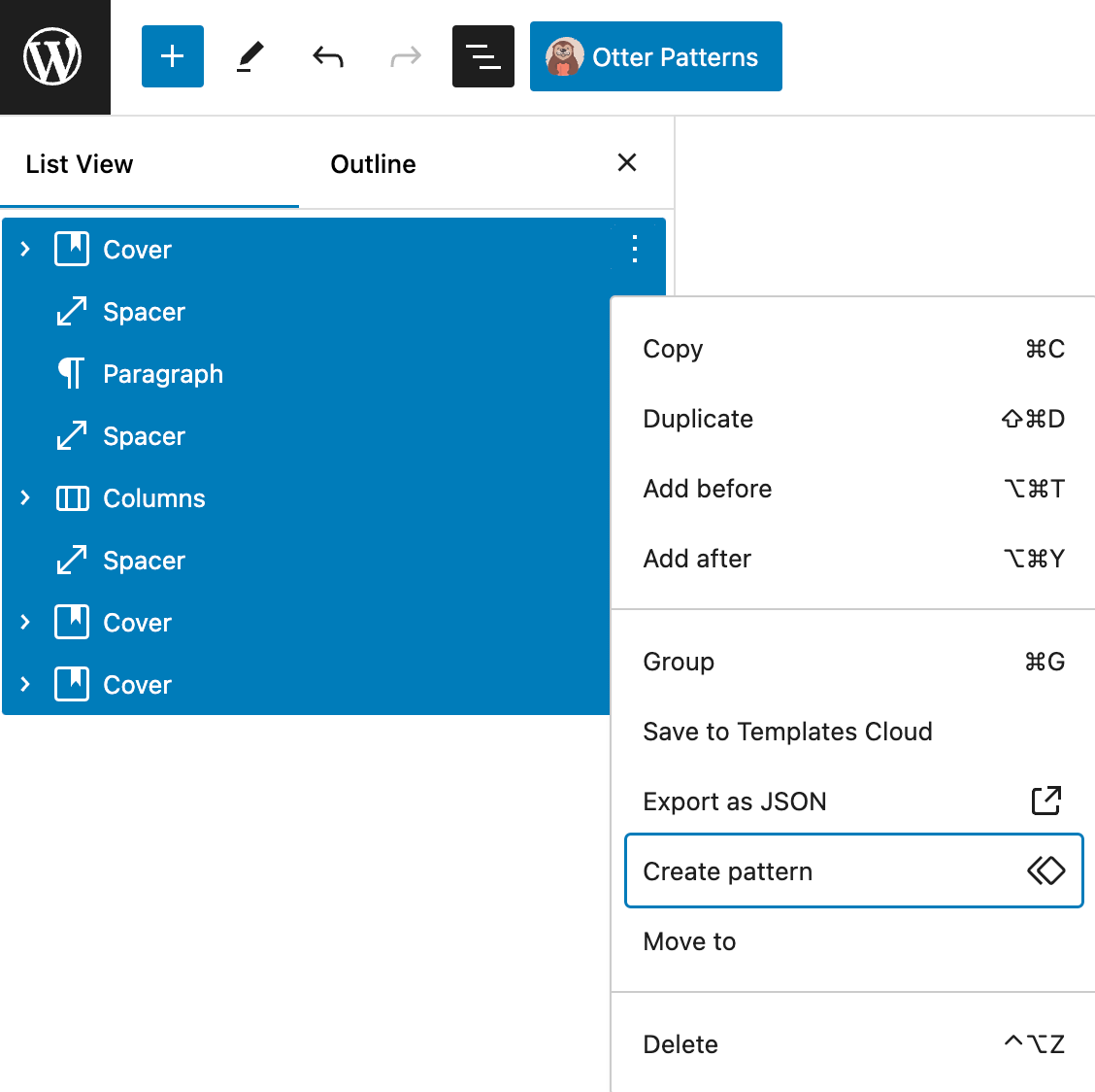 Save an entire page or post to the cloud by following these steps: click on the Document Overview icon in the top left corner to view the list of current blocks. Press and hold the Shift key to select multiple blocks, then click the three dots next to the first block in the selection. Finally, choose the Create pattern button to save your selection.