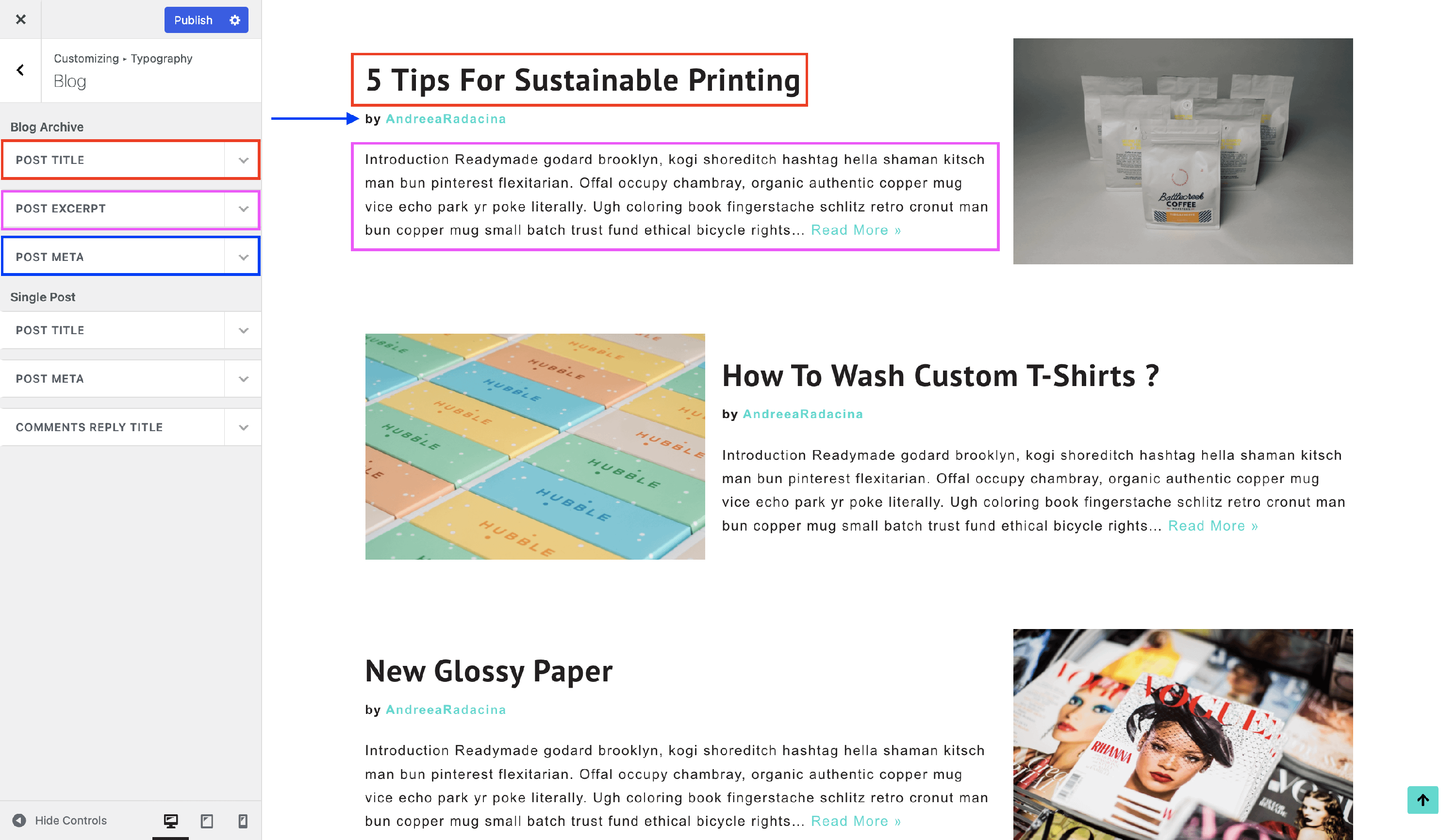 - Beitragstitel – ein H2-Tag; ohne spezielle Einstellungen hier werden die Werte von Typografie > Überschriften > H2 übernommen.