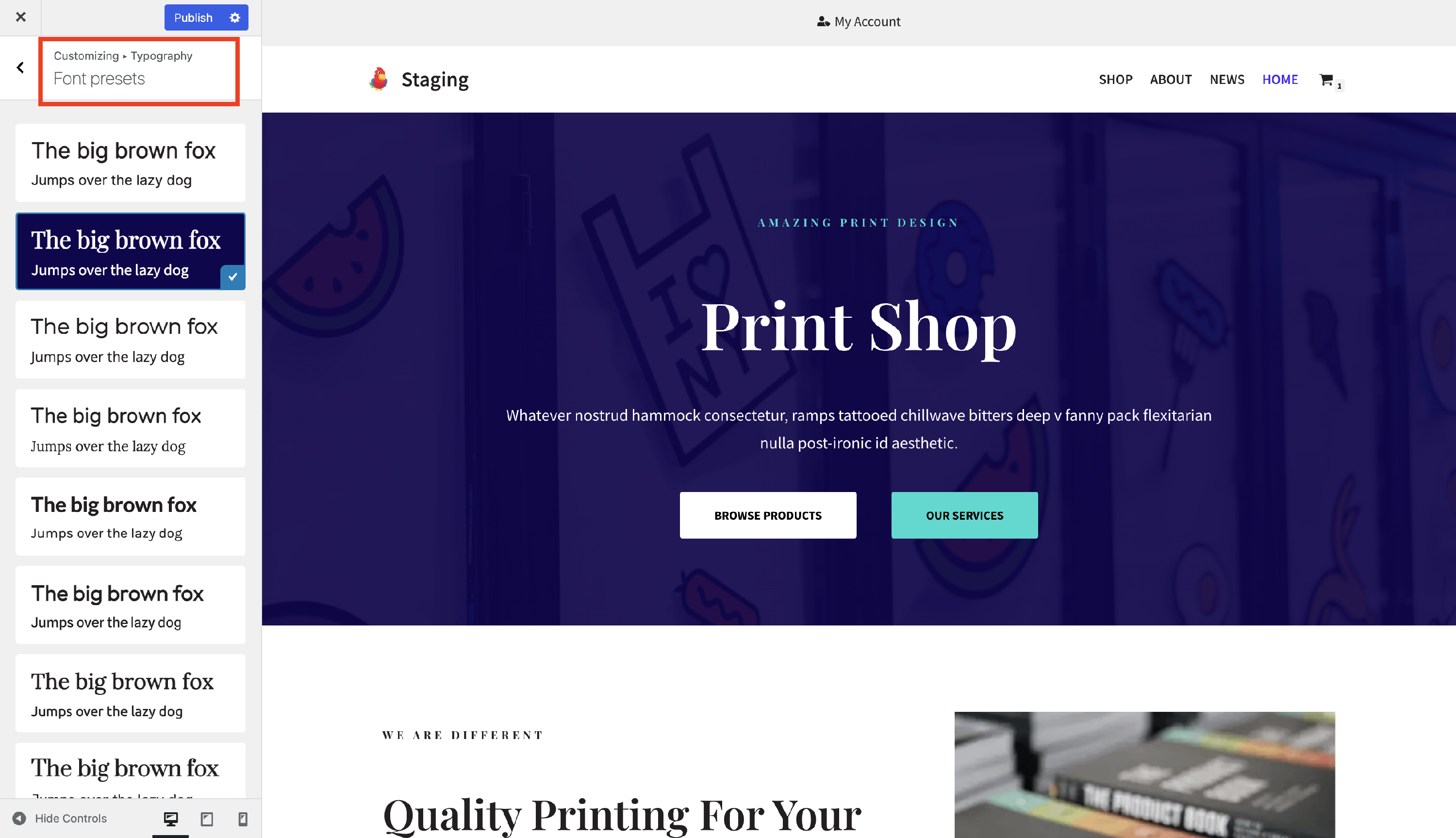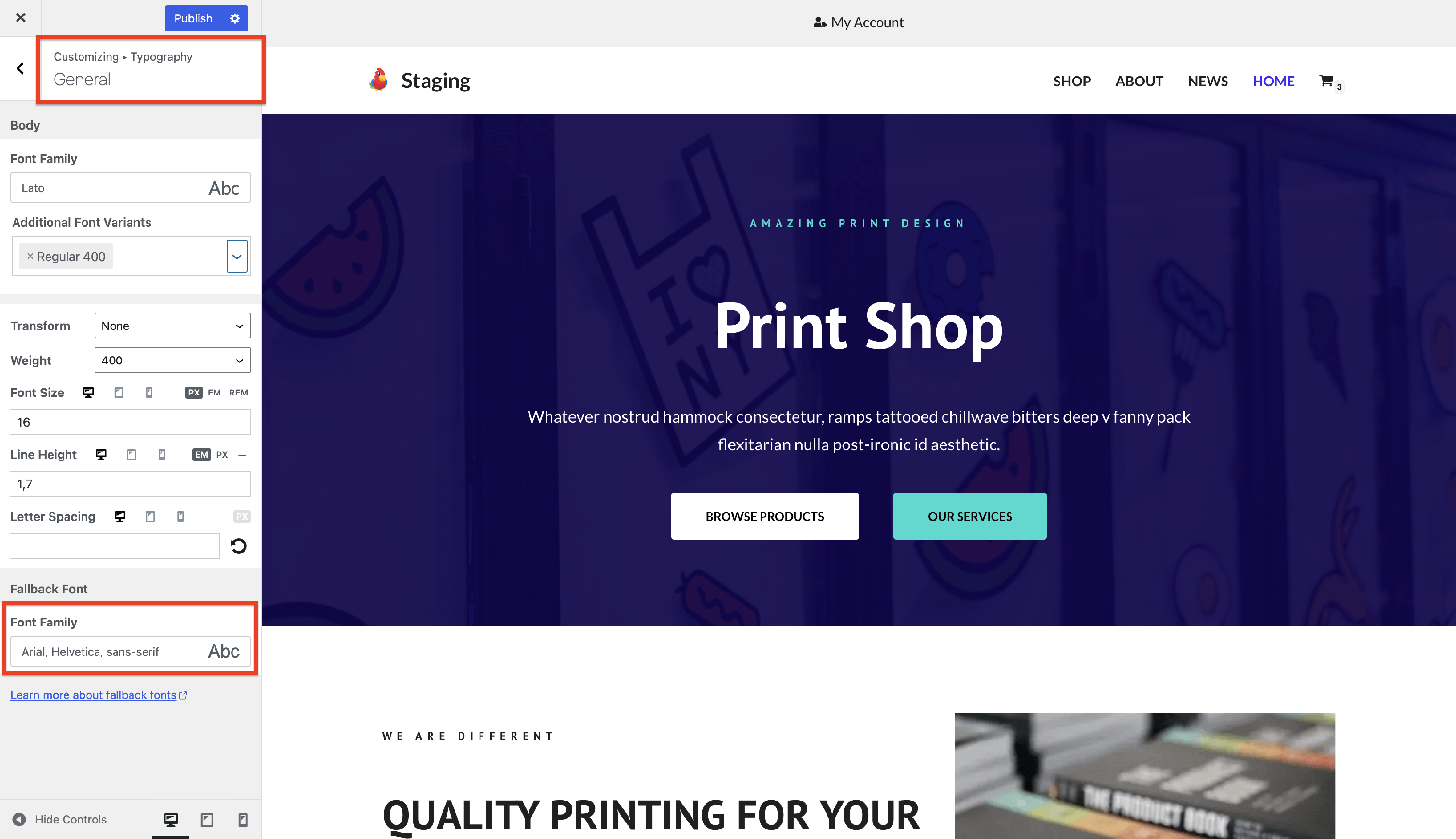 Diese Optionen sind verfügbar unter Dashboard > Design > Anpassen > Typografie und sind wie folgt kategorisiert: