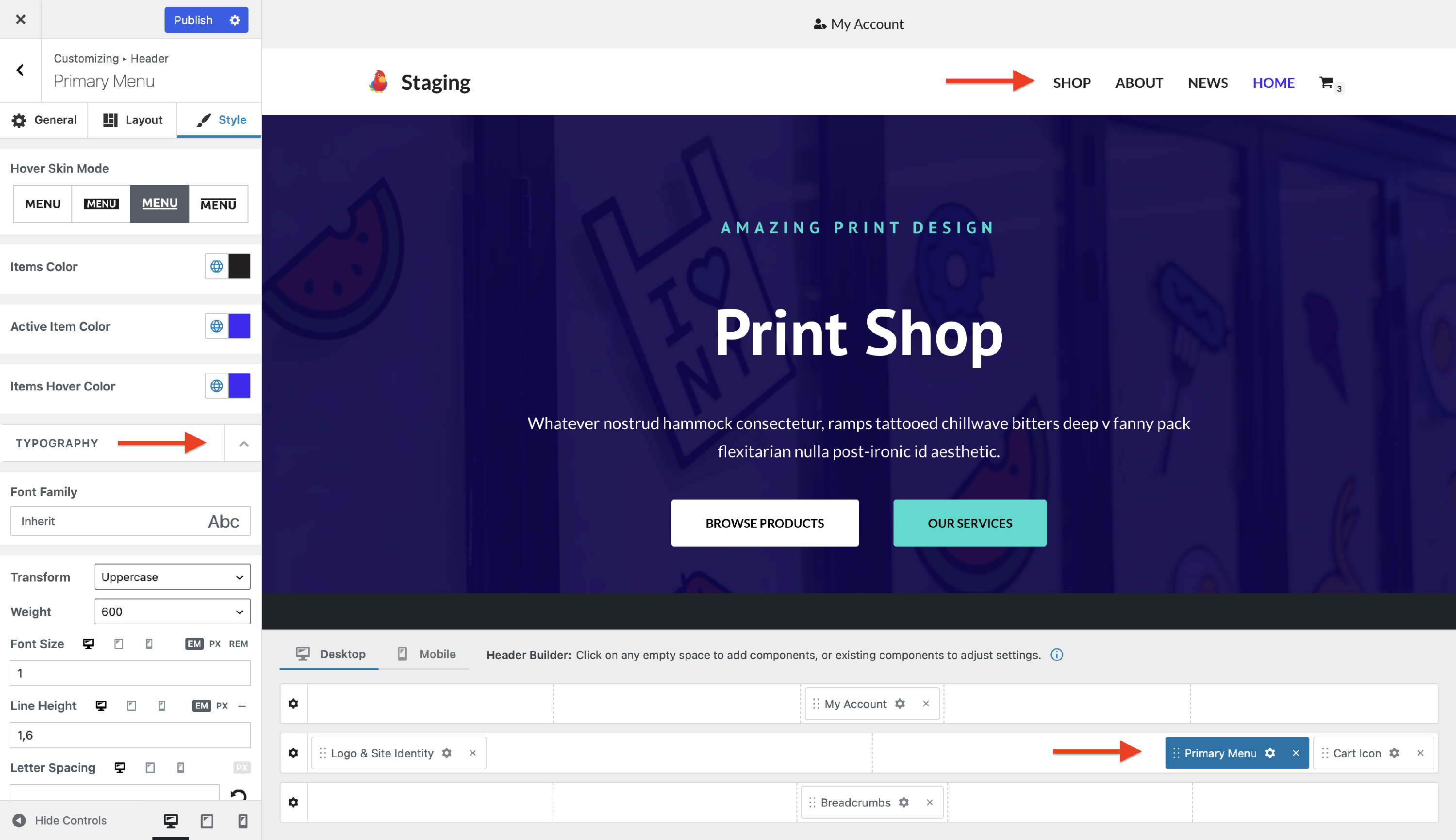 Spezielle Typografieoptionen sind für die Header- und Footer-Menüs verfügbar, während Sie die Komponenten im Header-/Footer-Builder bearbeiten. Die Menüs ermöglichen die Anpassung von Schriftfamilie, Texttransformation, Gewicht, Schriftgröße (PX, EM, REM), Zeilenhöhe und Buchstabenabstand.
