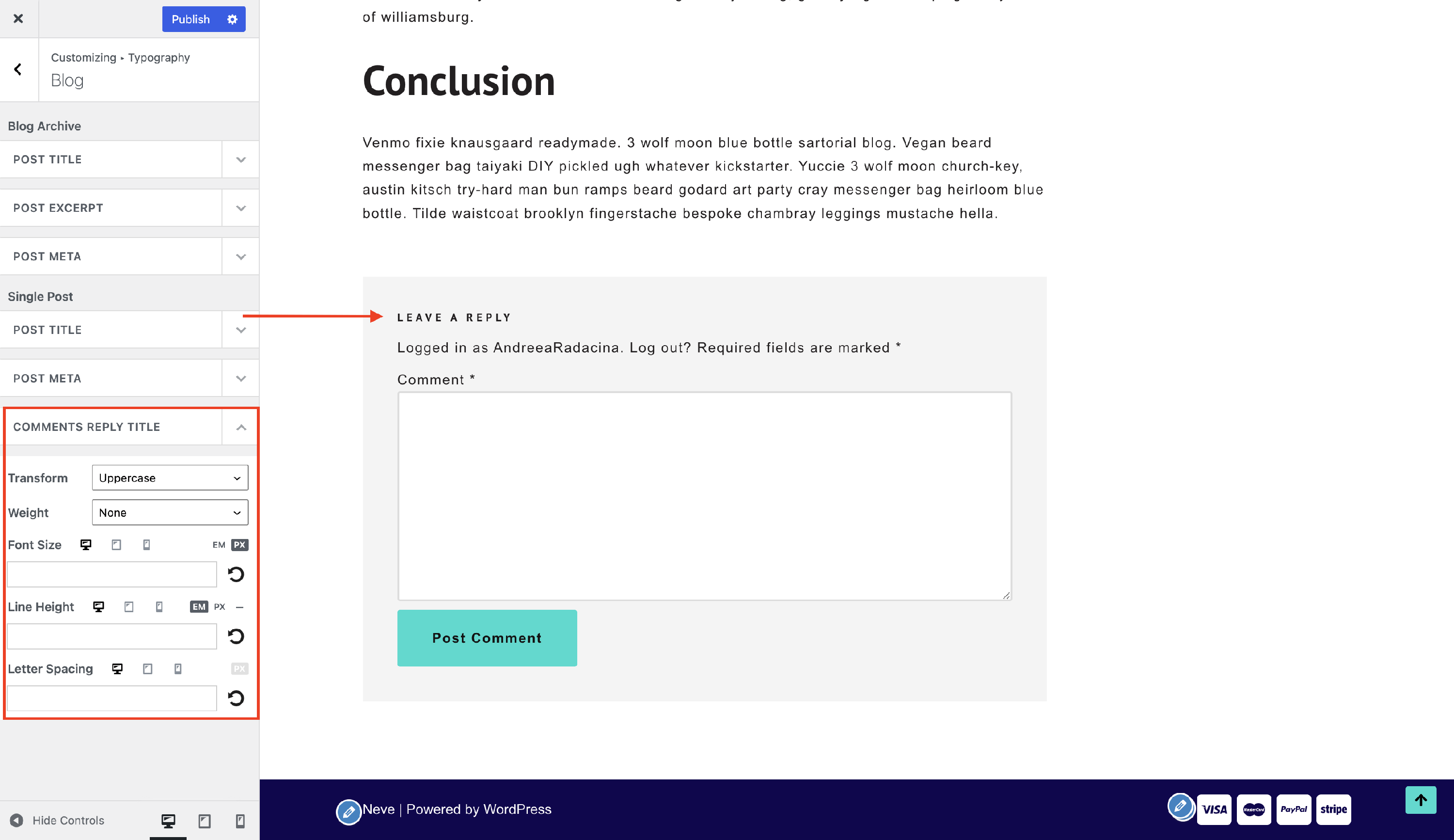 - Kommentar-Titel – ein H3-Tag; ohne spezielle Einstellungen hier werden die Werte von Typografie > Überschriften > H3 übernommen.