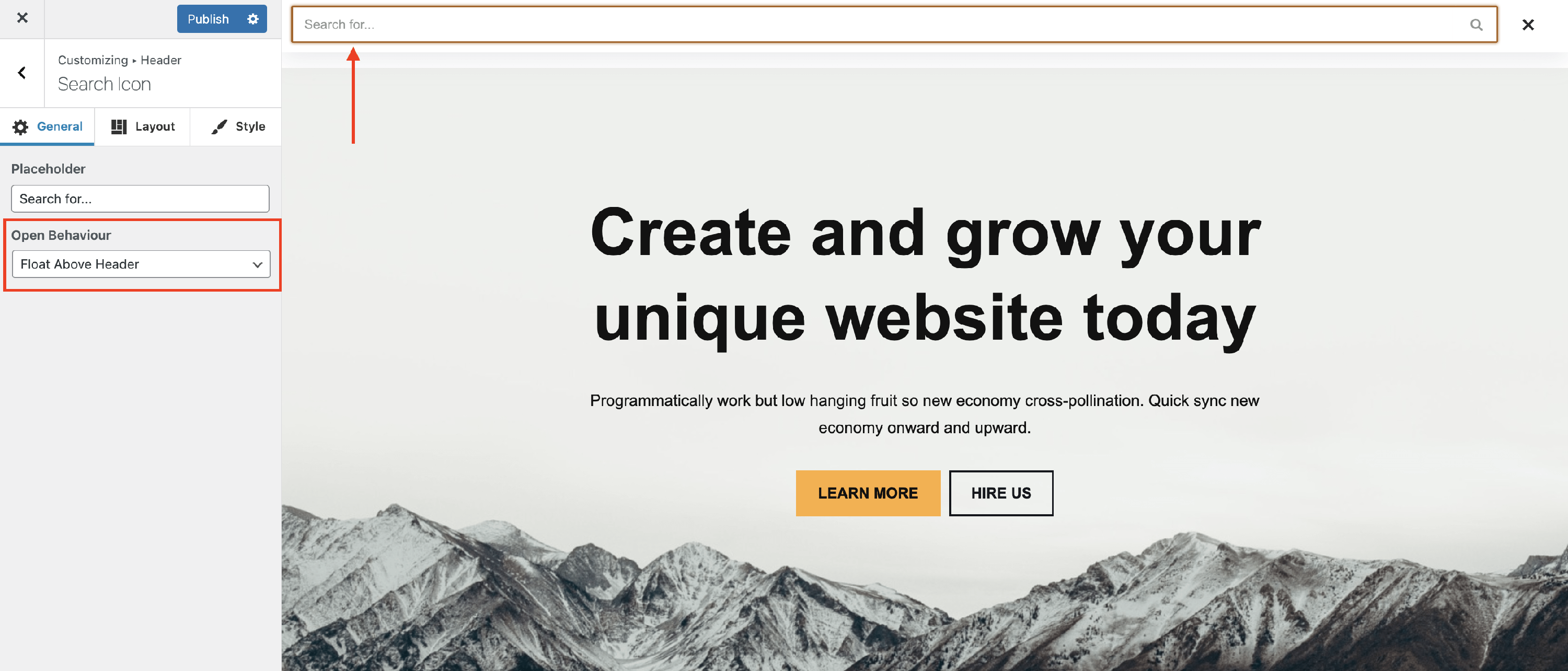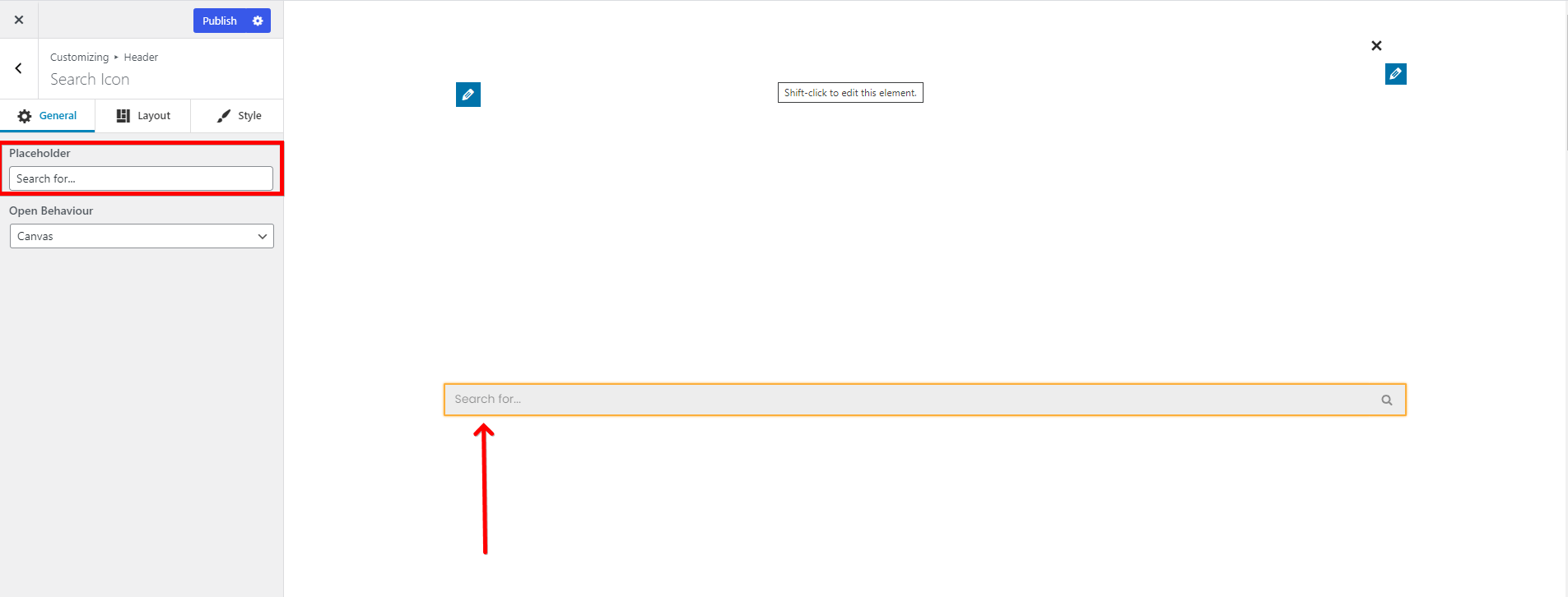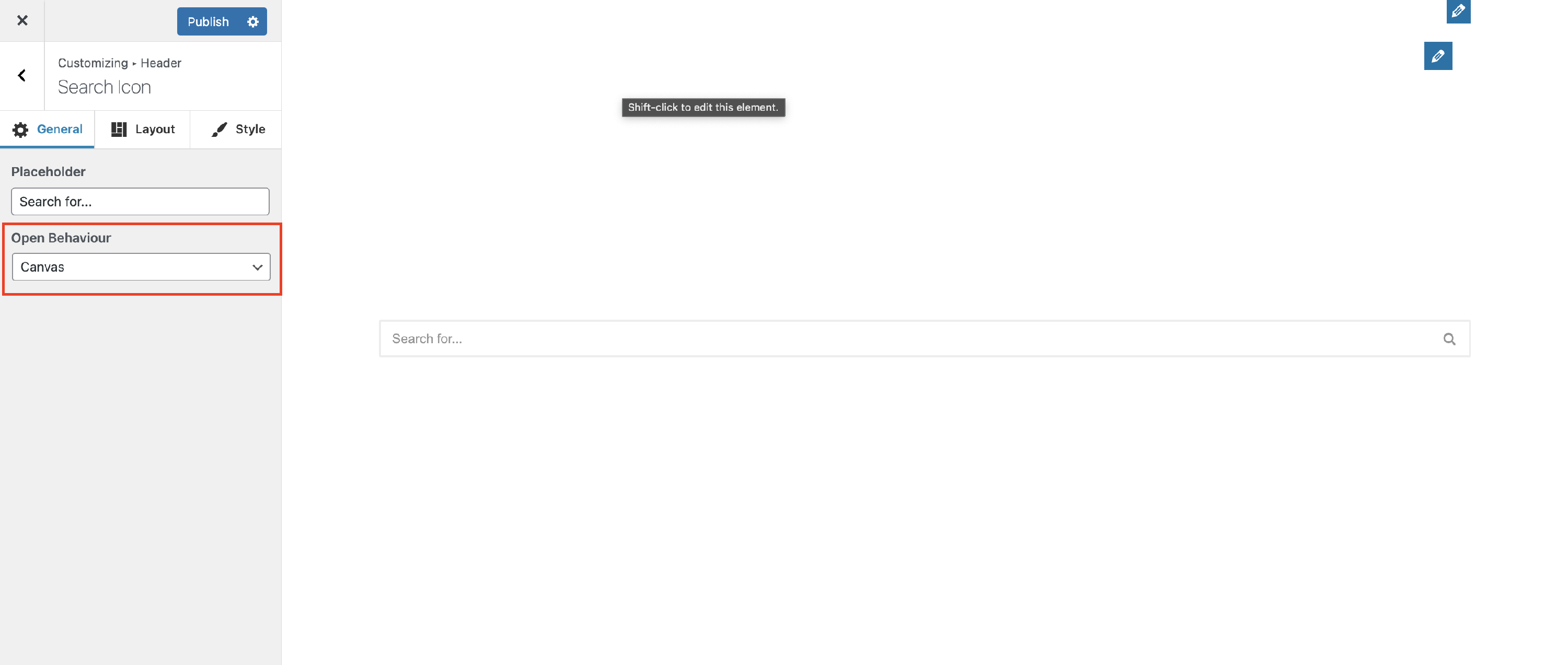 There are three options available for the open behavior of the Search Icon: