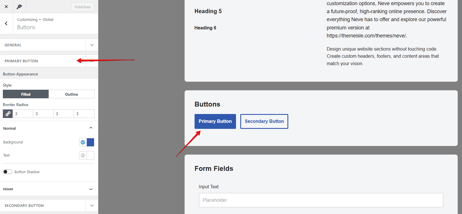 - Clicking a button jumps to Appearance > Customize > Global > Buttons.