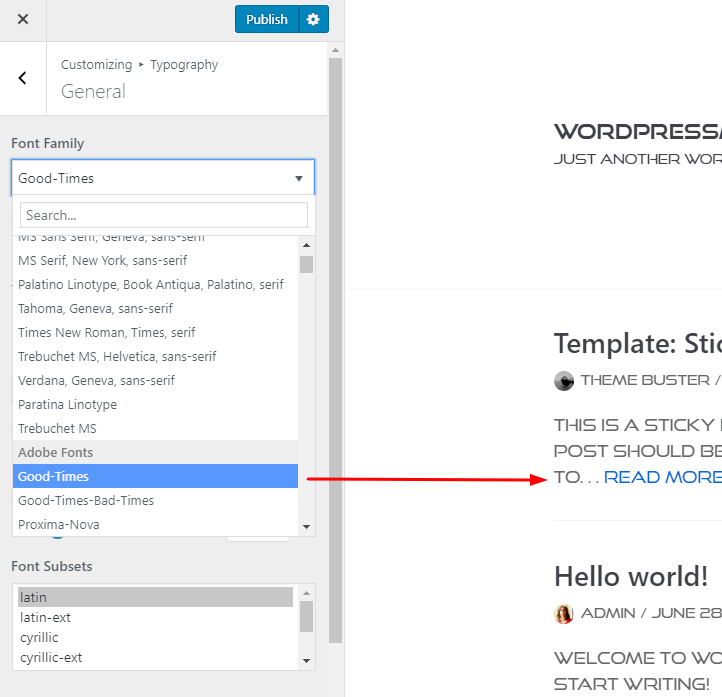 After everything is set up, you will be able to use all the fonts from your Adobe account by going to Appearance > Customize > Typography.