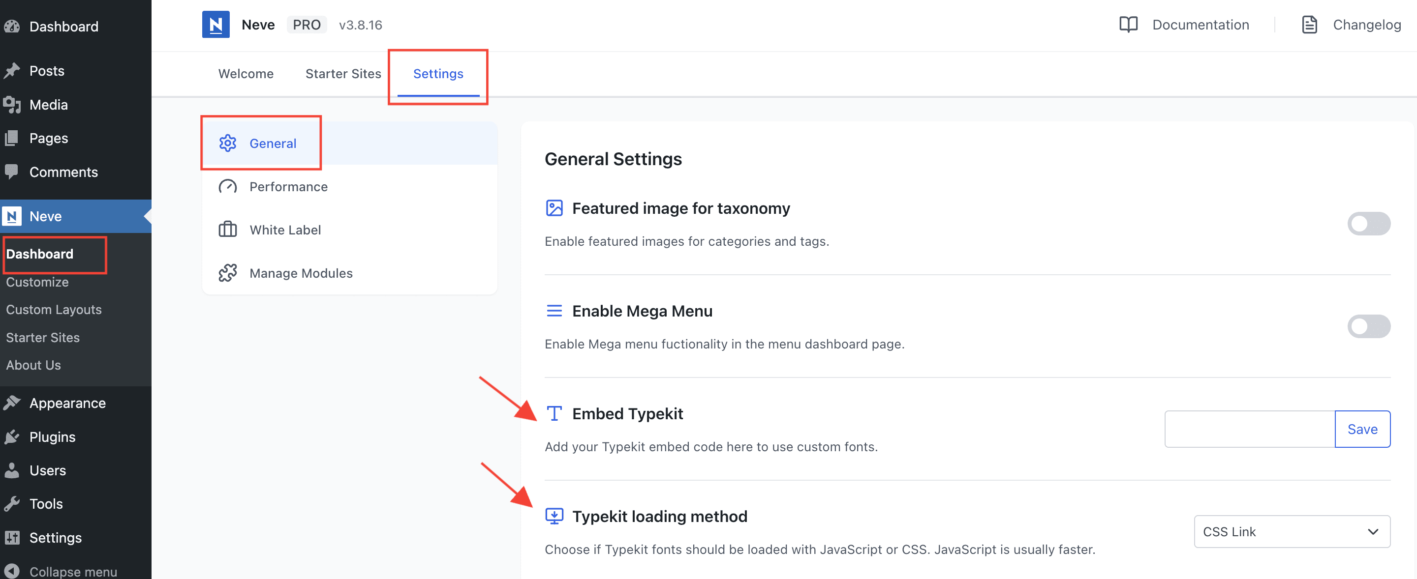 After the module is enabled, navigate to Neve > Dashboard > Settings > General so you can enter your unique Project ID and choose a loading method for the fonts, which can be either CSS Link or JavaScript.