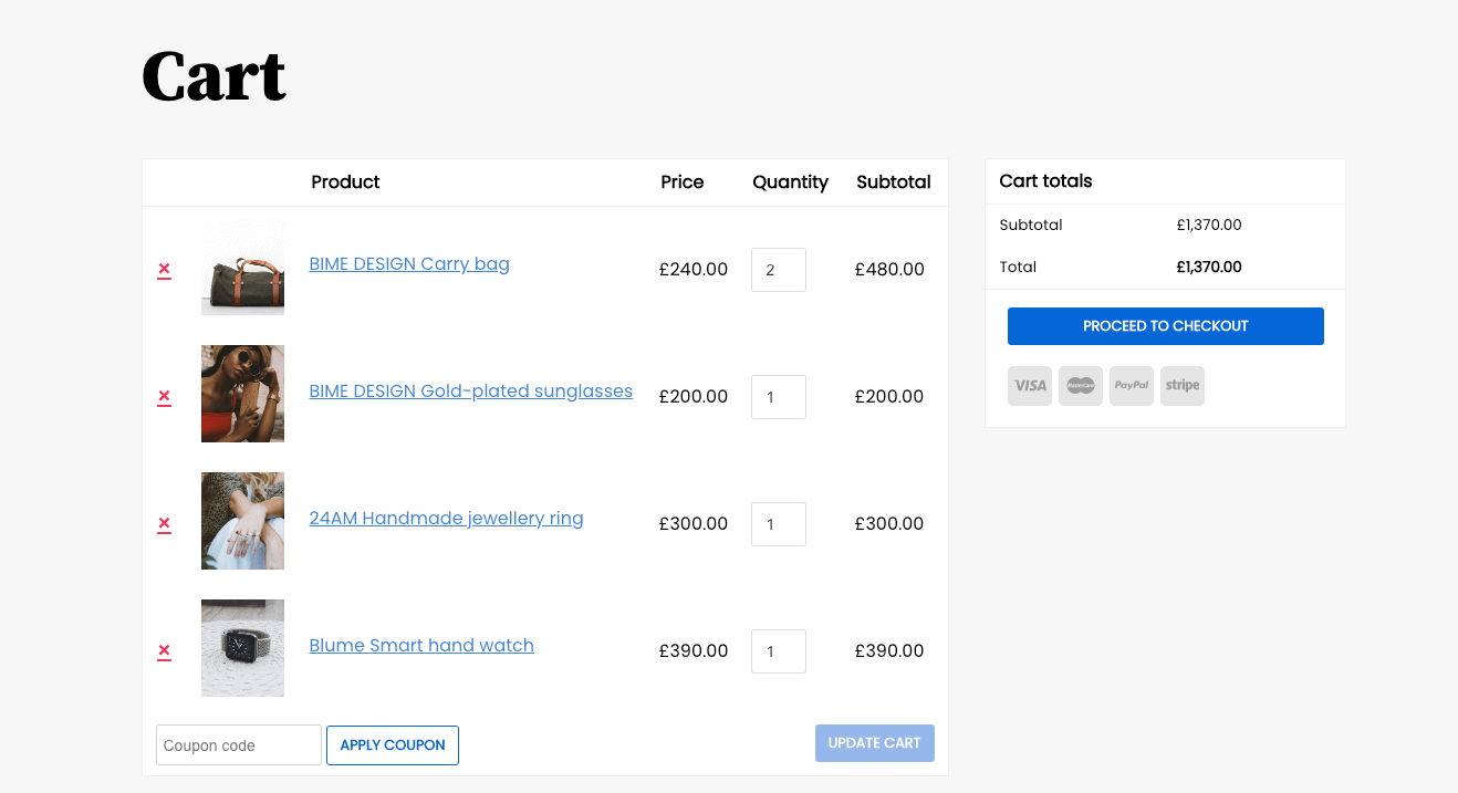 | The search icon will open a form above the whole page content while the cart icon can behave differently, by redirecting the user to the cart page or displaying the mini cart in the header, or the off-canvas cart as a sidebar. | ||