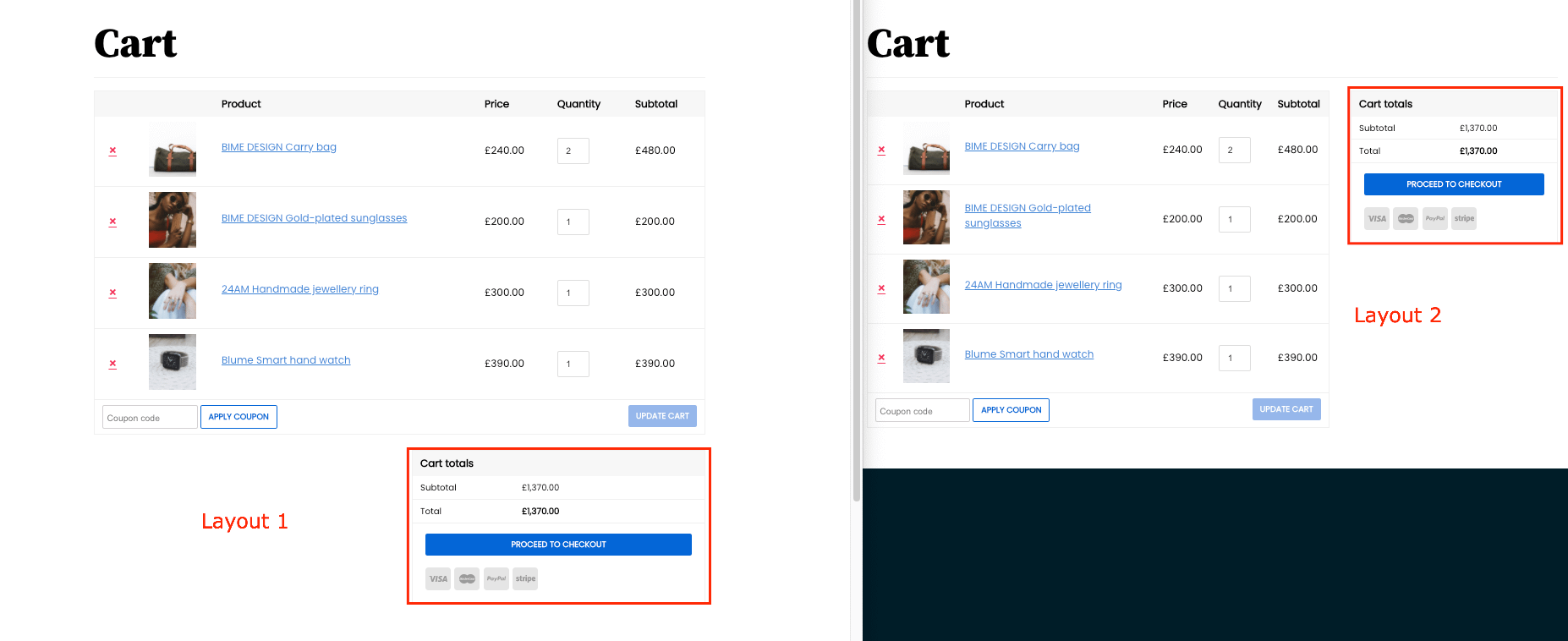 It works only for the Standard layout and it makes the cart totals box sticky. | - | Yes | |