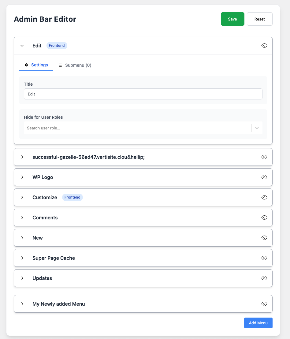 This feature provides similar functionality to the Admin Menu Editor but for the WordPress Admin Bar.