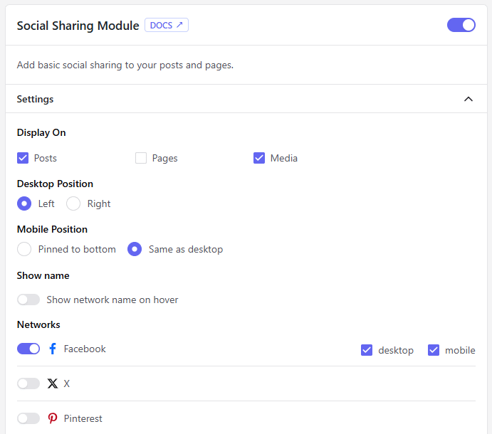 Add social sharing buttons to your Posts, Pages, and Media. Choose which social networks to display and configure separate settings for mobile and desktop devices, including button position and network selection.