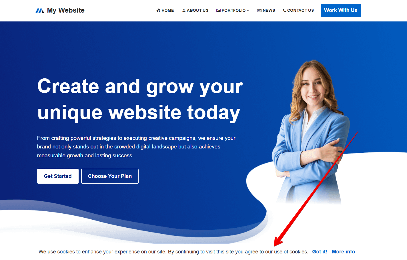 Add a simple cookie notice bar to your website. Configure the text and links directly in the General Settings dashboard.