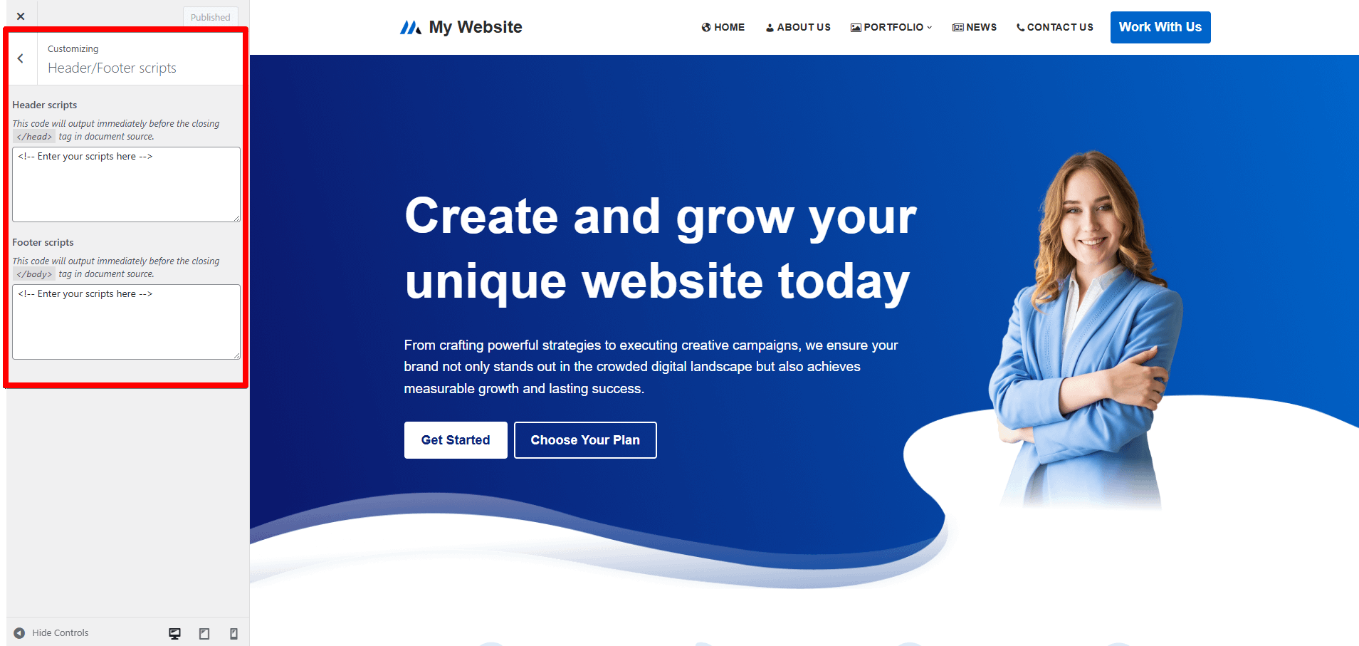 - Global scripts that will execute on every page of your website. These are managed through WordPress Customizer and apply site-wide.