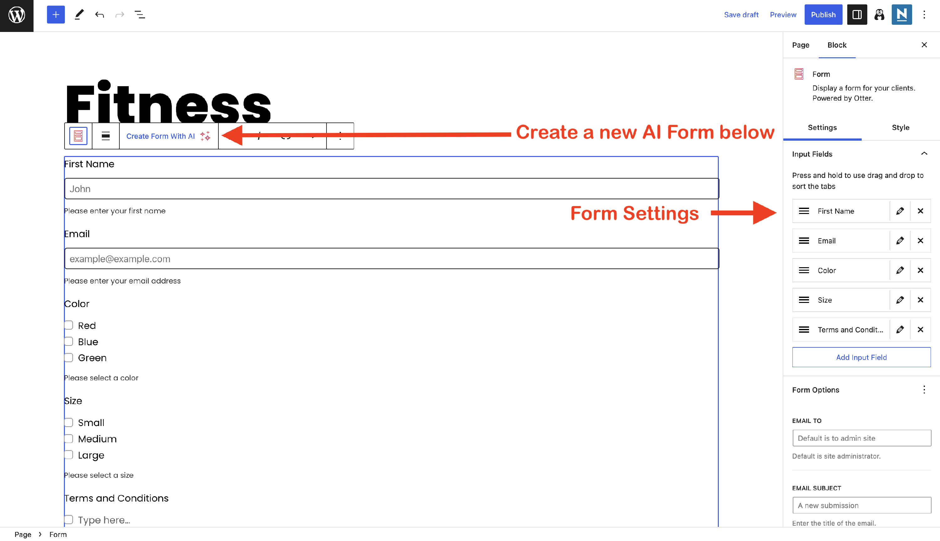- Insert below - insert the generated form below the Ai Block/Prompt Editor with the regular form settings (add new fields, email to, etc).
