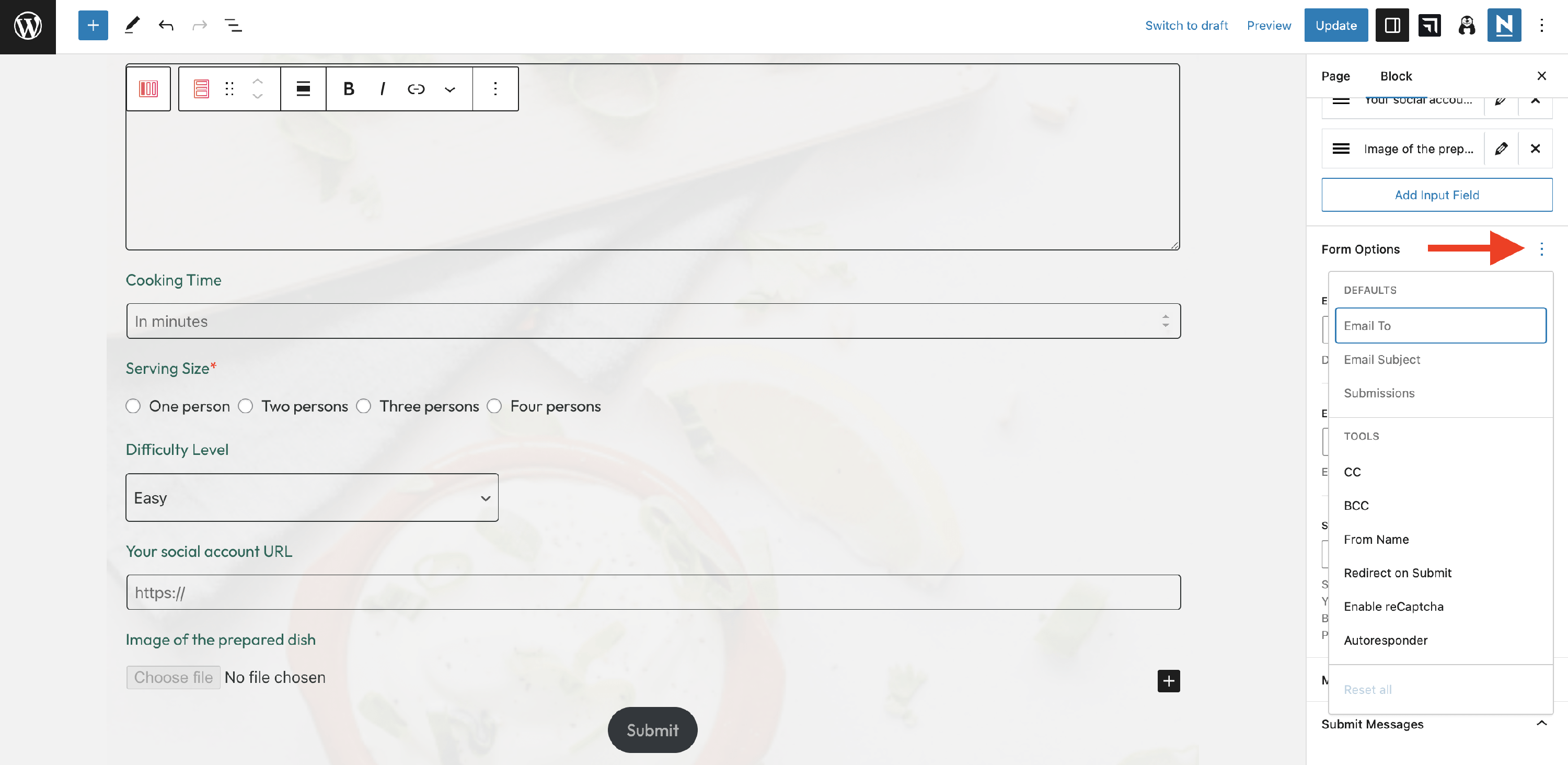 Form Options - here, you will find the configurations of the email itself for the main address where you want to store emails, as well as for Cc and Bcc:
