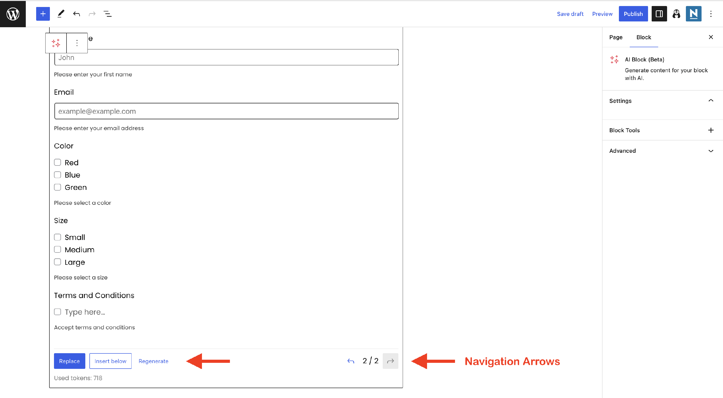 - Replace -ย replace the AI Block with a Form block, which allows you to edit the fields. After making this change, the prompt cannot be modified.