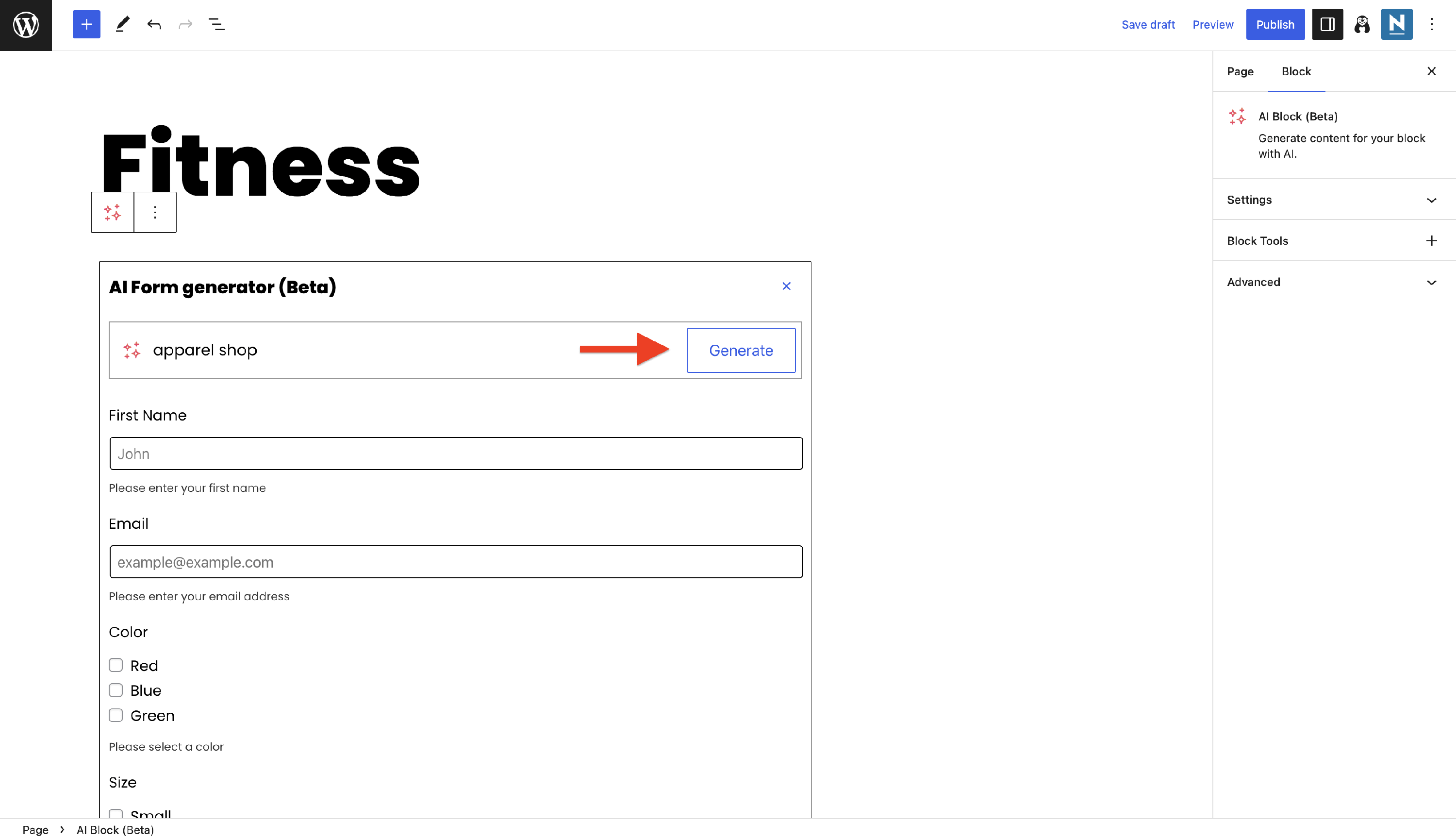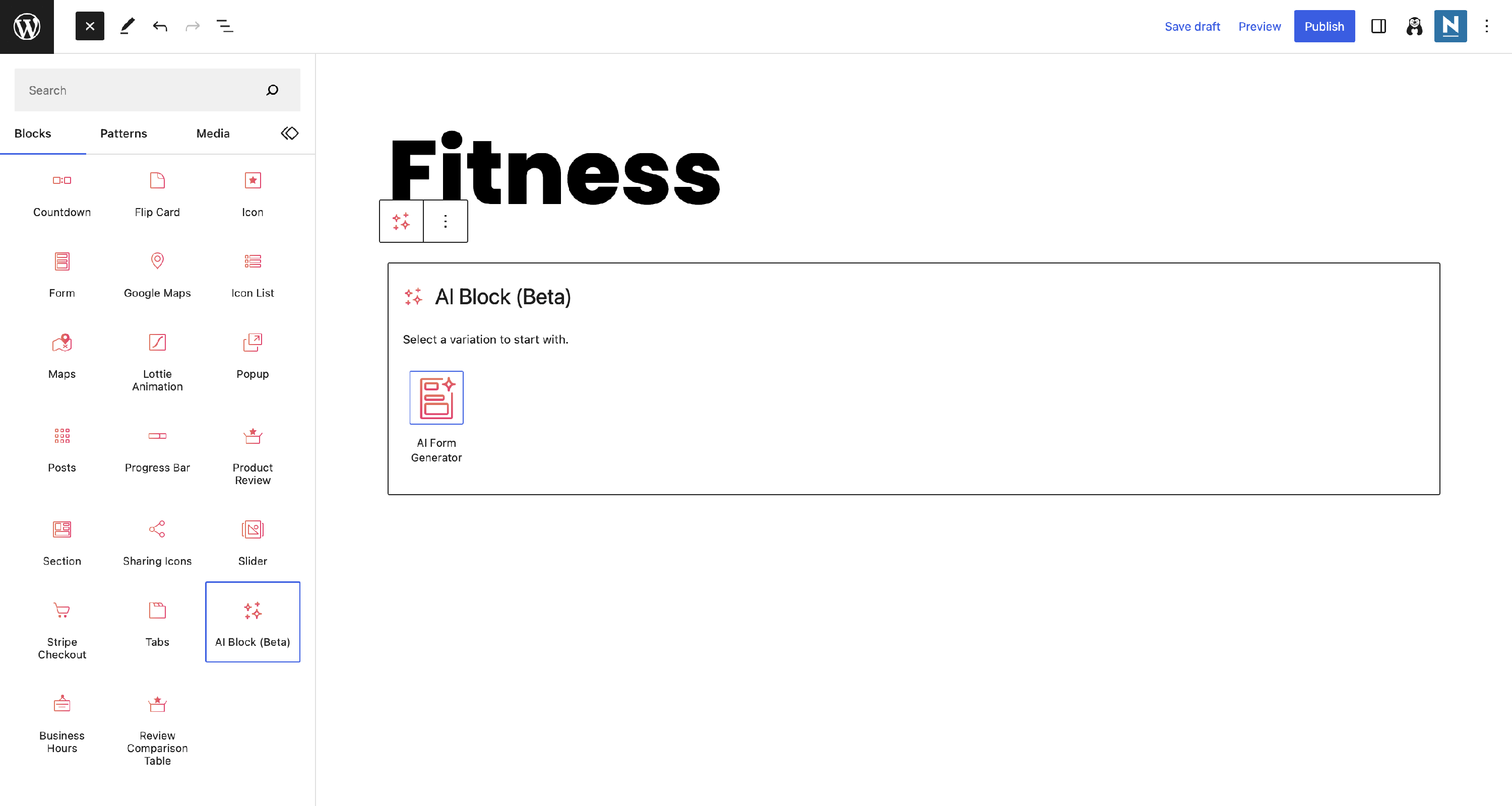 Unlike the Contact and Subscribe forms, which are part of the Form block, the AI-based form is a standalone block, part of the AI Block, which you have to add to your editor.
