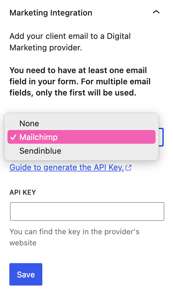 - Marketing Integration - Mailchimp and SendinBlue providers are available.